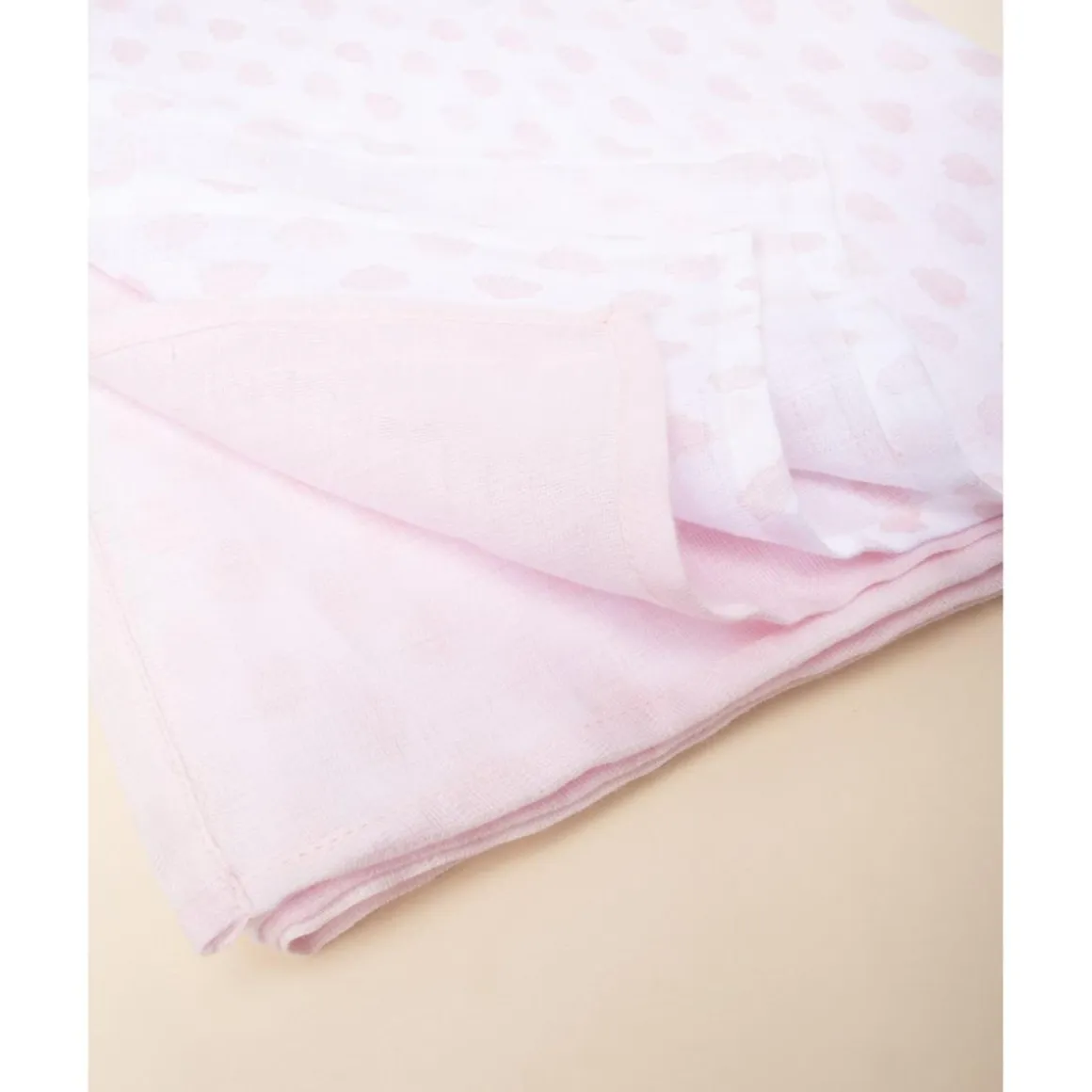 Las muselinas presentan un delicado estampado de nubes estilizadas sobre fondo blanco, en tonos rosa claro.