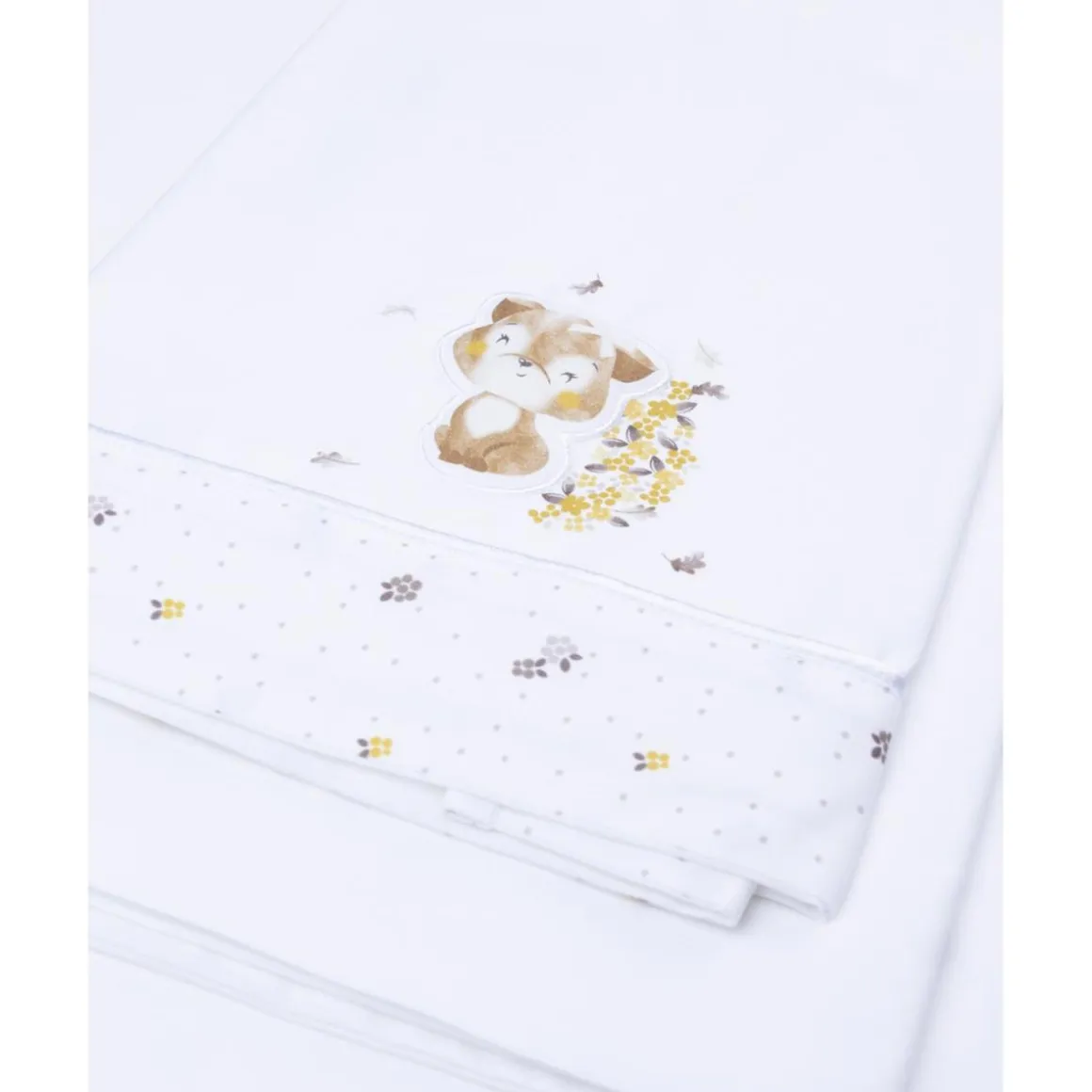 Este set de sábanas de cuna envuelve al bebé con suavidad y transpirabilidad natural. Incluye sábana bajera blanca, sábana encimera con banda aplicada y estampado all over de inspiración otoñal, y funda de almohada coordinada con un tierno perrito. Su tacto agradable ayuda a mantener una temperatura confortable, tanto en cuna como en capazo, y su estética serena aporta un estilo dulce y atemporal al dormitorio.