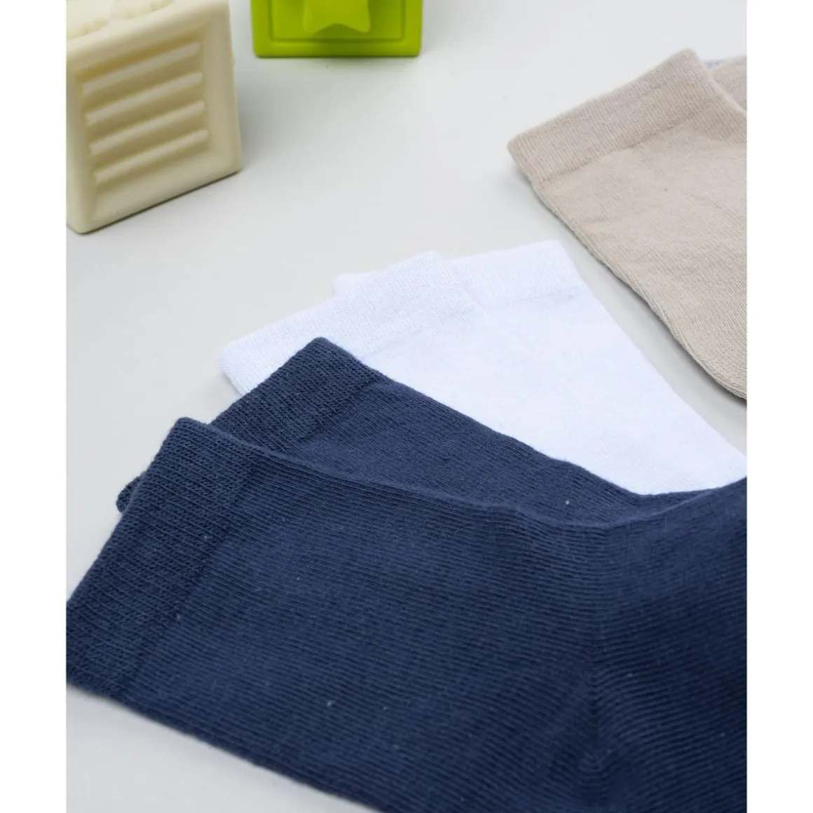 Este pack de calcetines incluye cuatro pares básicos y versátiles para el armario infantil. Confeccionados en suave punto, están diseñados en tonos azul marino, gris, marrón y blanco, lo que permite combinarlos fácilmente con distintos conjuntos.