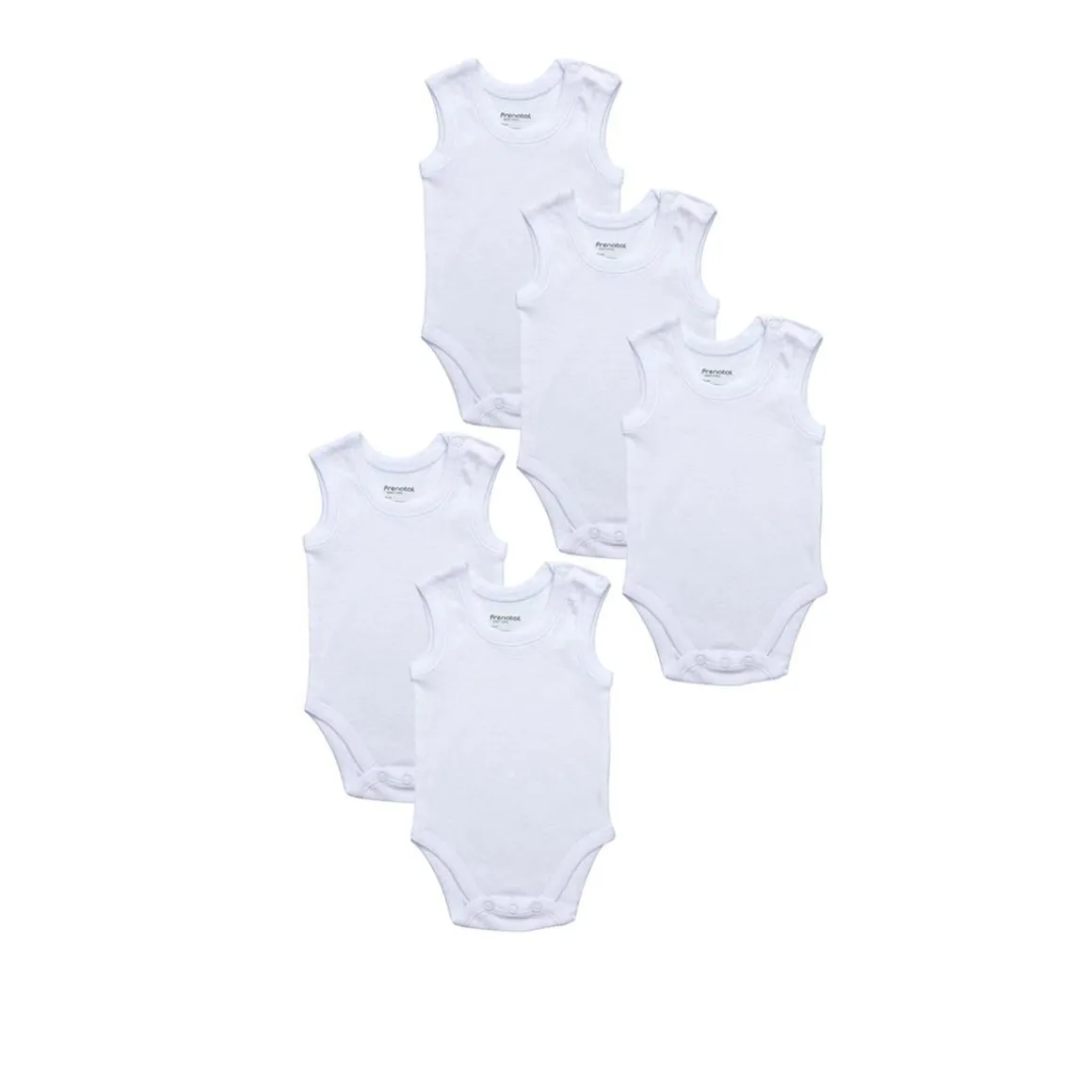 Pack compuesto por cinco bodis de algodón de color blanco sin mangas y cuello redondo con broches en el hombro y en la entrepierna para un ajuste práctico y cómodo. Accesorios no a la venta. El paquete contiene sólo la prenda de vestir.