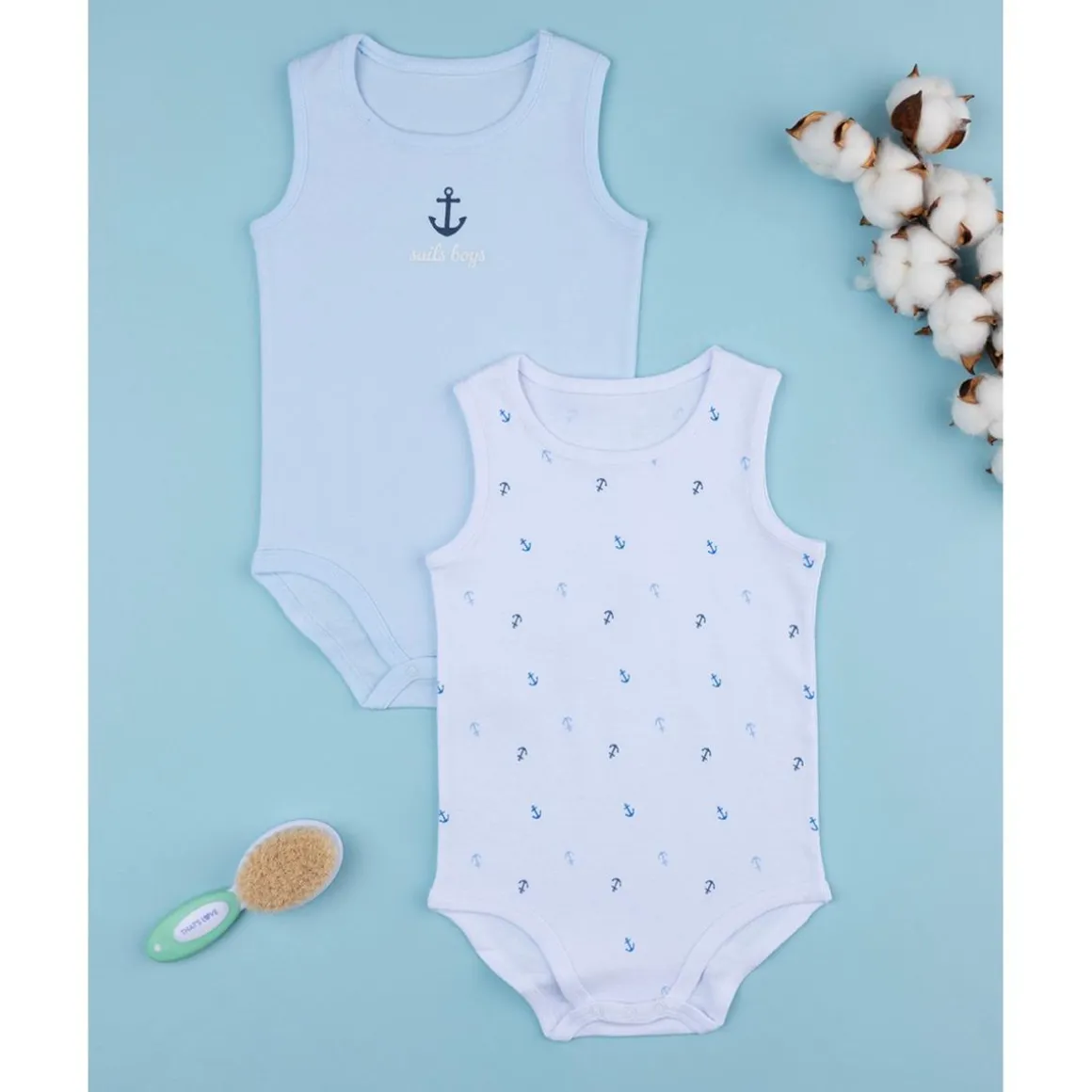 Práctico pack de 2 bodies infantiles en blanco y azul claro con motivos de anclas coordinados. Botones en la entrepierna para fácil cambio de pañal.