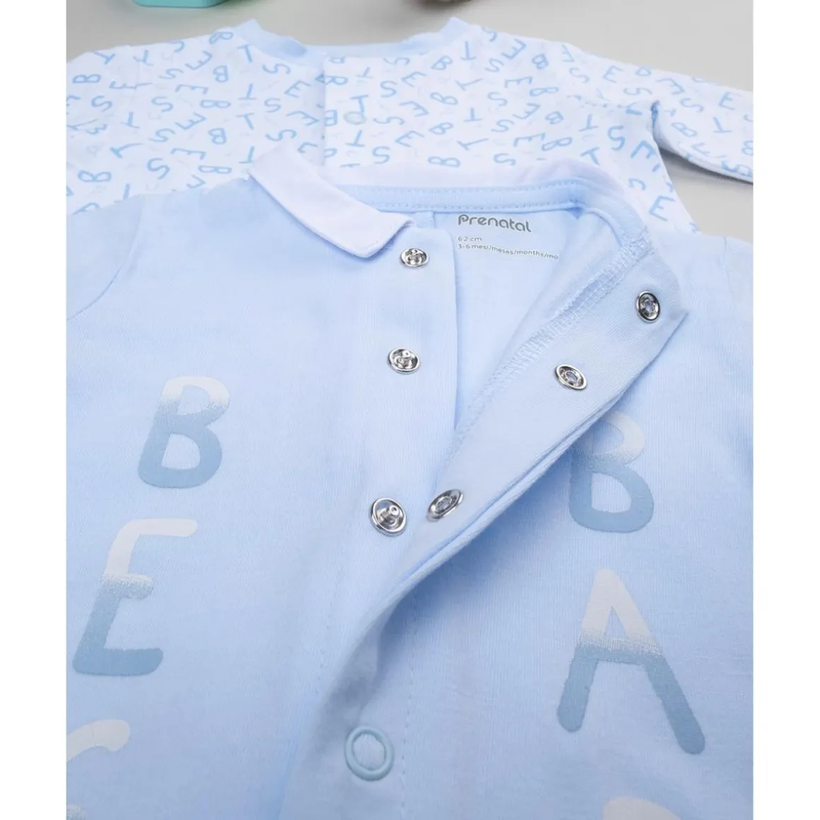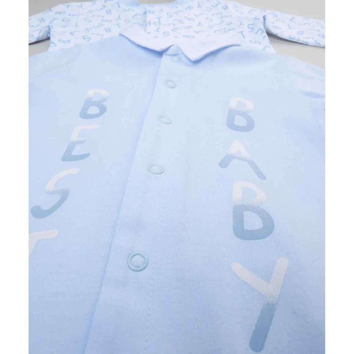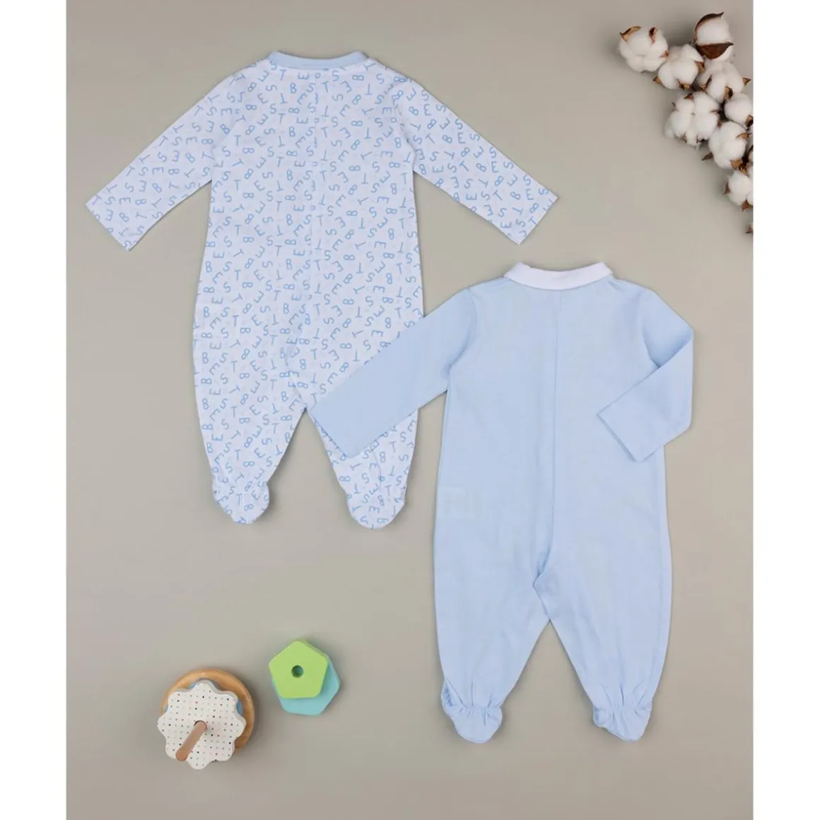 Este práctico pack consta de dos pijamas de jersey con mangas largas y cierres automáticos en la parte delantera y en la entrepierna. Uno de los pijamas es azul con la inscripción «Best baby» estampada en el frente, mientras que el otro es blanco con un estampado completo de la palabra «Best» en azul.