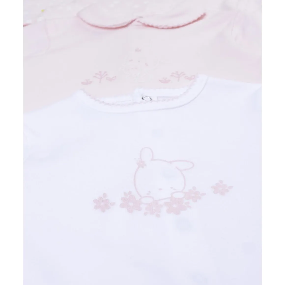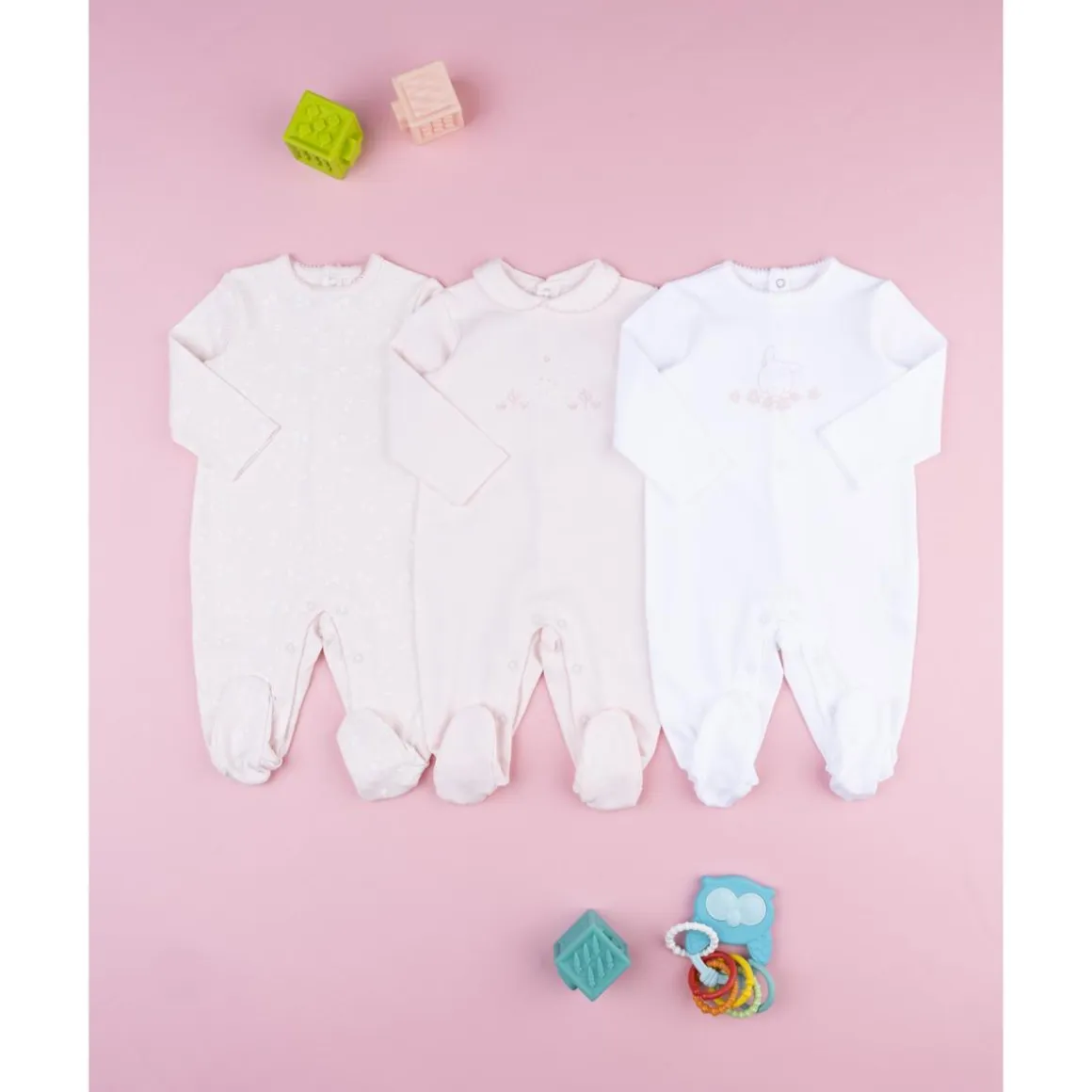 Este pack incluye tres peleles largos con pies, diseñados en algodón interlock para ofrecer la máxima suavidad. Uno en blanco con estampado de conejito, otro en rosa con patrón allover y el tercero en rosa con estampado frontal, cada uno con detalles delicados que aportan encanto al conjunto.