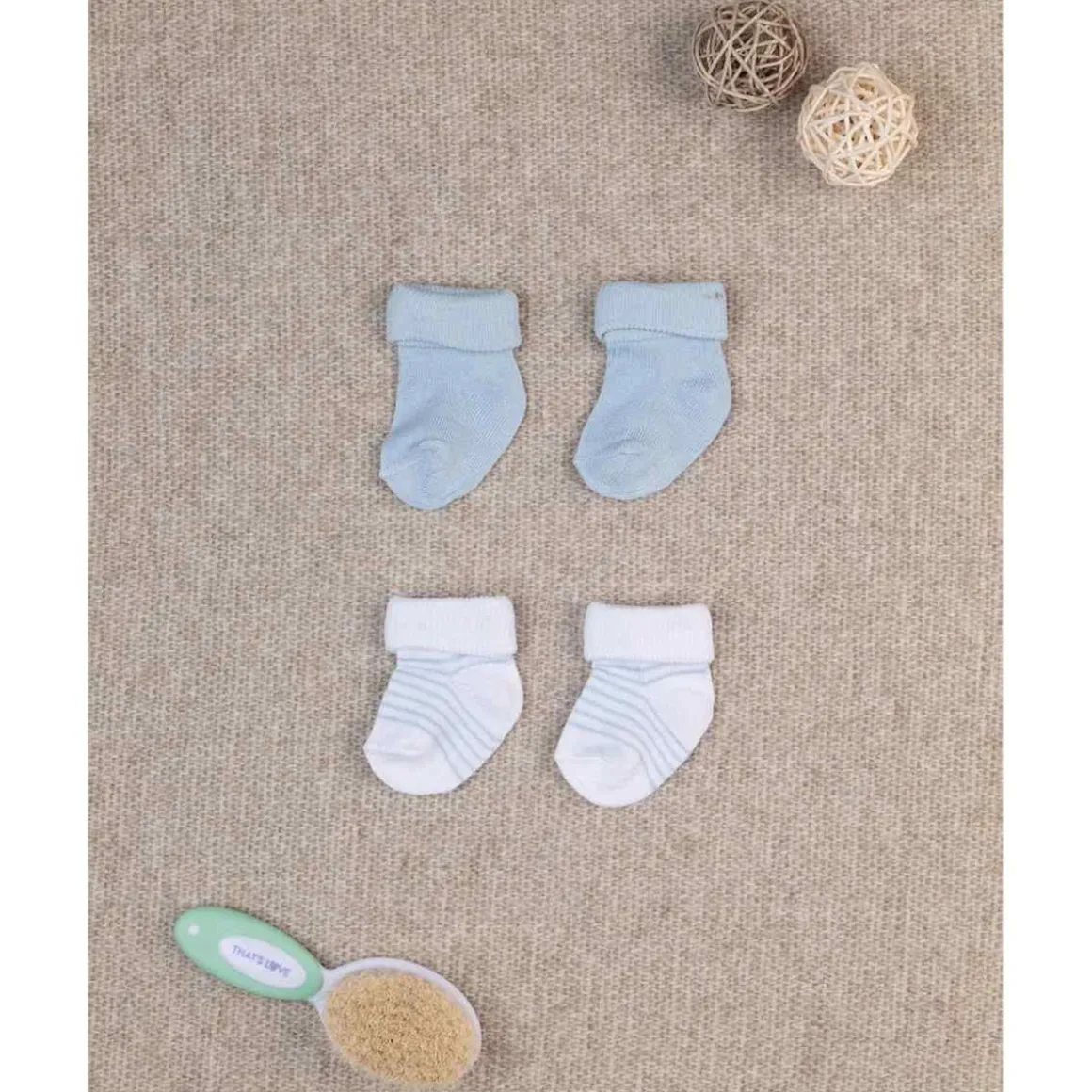 Empaque 2 pares de calcetines de algodón. Un par es liso de color azul claro. El otro es blanco con rayas azules. Accesorios no a la venta. El paquete contiene solo la prenda de ropa.