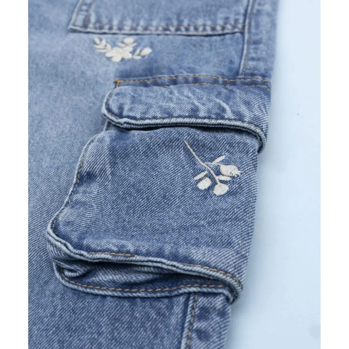 Encantador pantalón para niña en denim azul claro con estampado allover de florecitas. Con bolsillos delanteros moldeados, bolsillos laterales tipo cargo y traseros. Cintura ajustable con elástico y botón.
