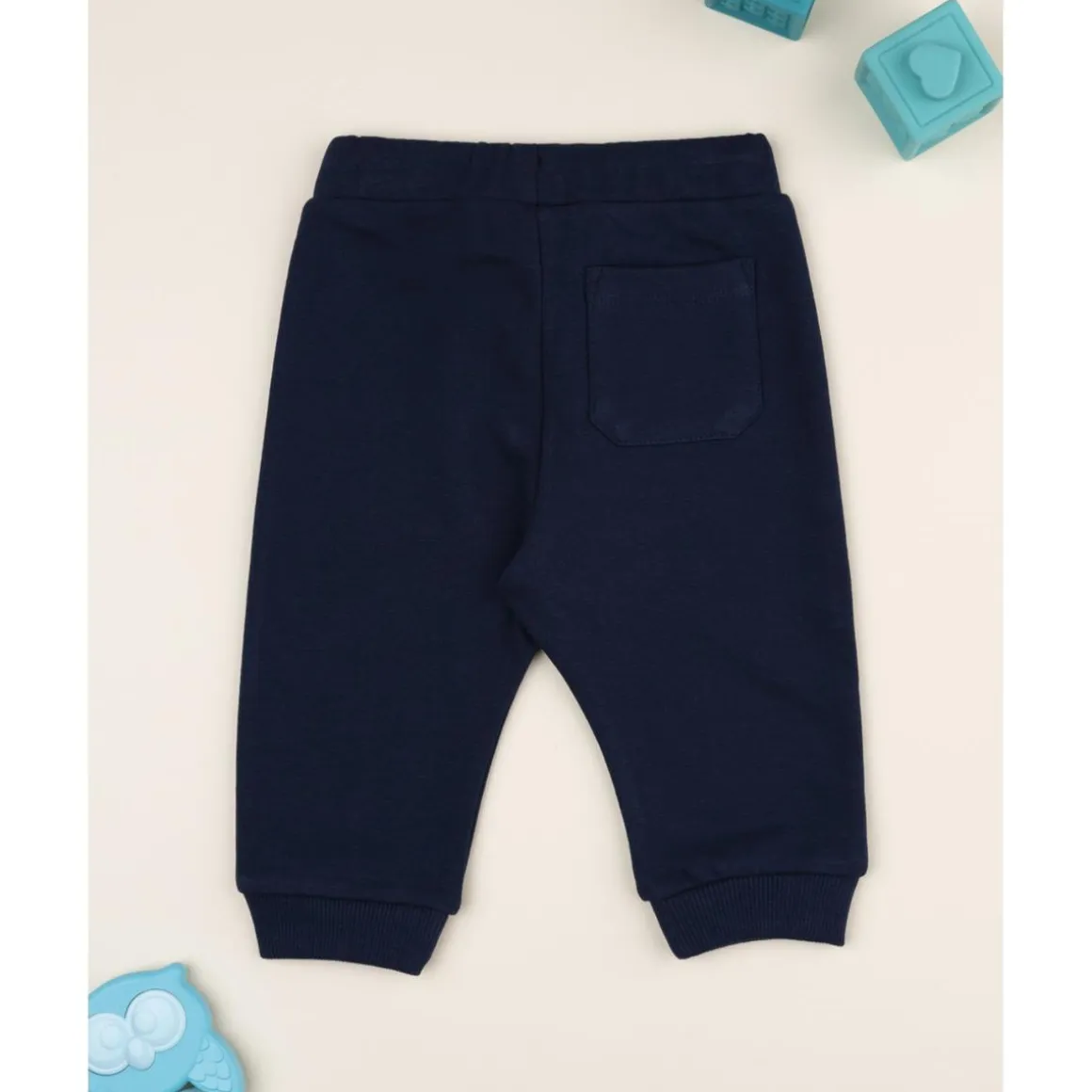 Pantalón básico en french terry azul noche. Ajuste cómodo y regulable gracias al cordón en la cintura. Ideal para ocasiones casuales y fácil de combinar.