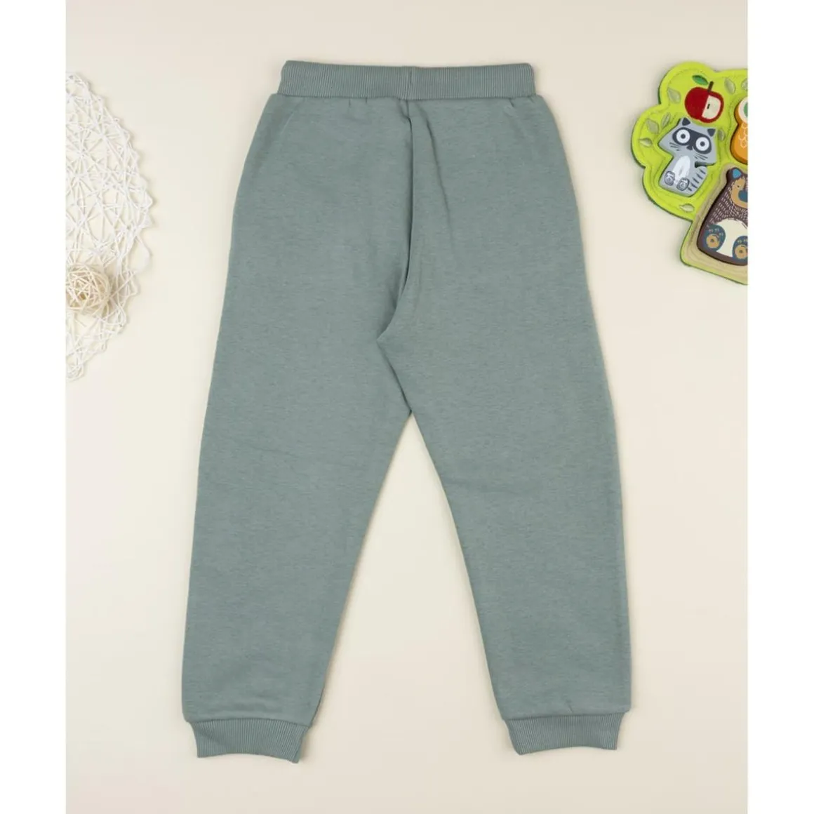 Versátil pantalón felpado para niño en color verde intenso, con pequeño estampado decorativo y bolsillos de corte transversal en la parte delantera. La cintura con cordón ajustable proporciona ajuste cómodo y seguro para los momentos de juego y actividad.