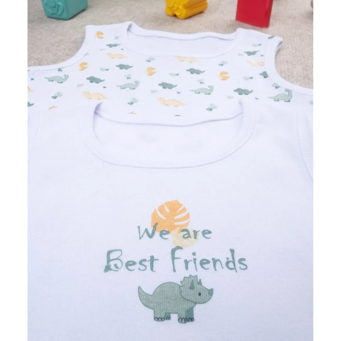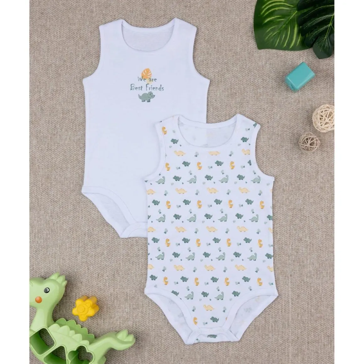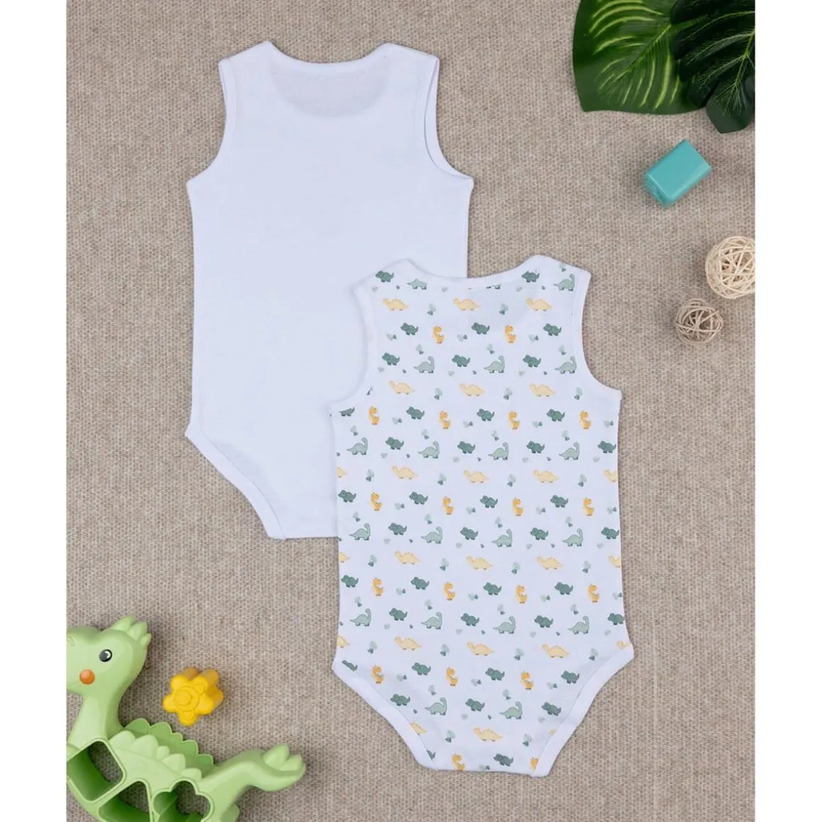 Paquete básico 2 bodis para bebé con costina. Las prendas se presentan con un modelo de camiseta sin mangas y se desarrollan sobre una base blanca con estampado de Dino en color coordinado. El ajuste es suave y práctico gracias a los botones automáticos en la entrepierna. La prenda es de algodón oeko-tex, probada para sustancias nocivas garantiza alta seguridad. Accesorios no a la venta. El paquete contiene solo la prenda de vestir.