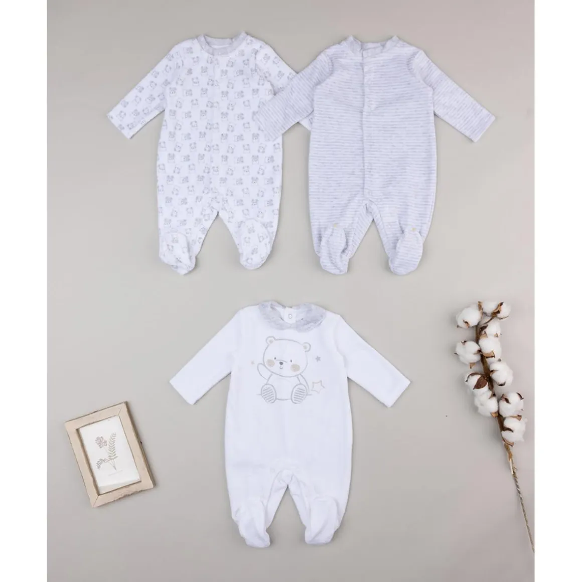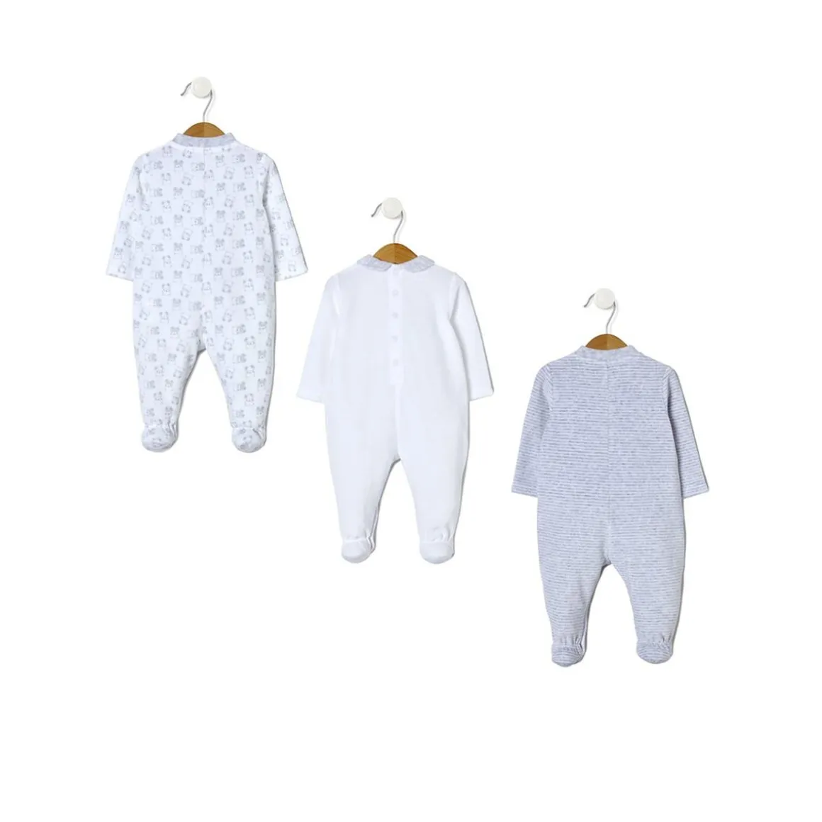 Paquete de tres peleles de terciopelo con manga larga y cuello redondo. Un pelele es de color blanco liso con osito estampado en el frente y automáticos en la parte trasera y en la entrepierna; otro es gris con rayas crema y automáticos en el frente y el tercero es blanco con estampado integral de tiernos ositos.