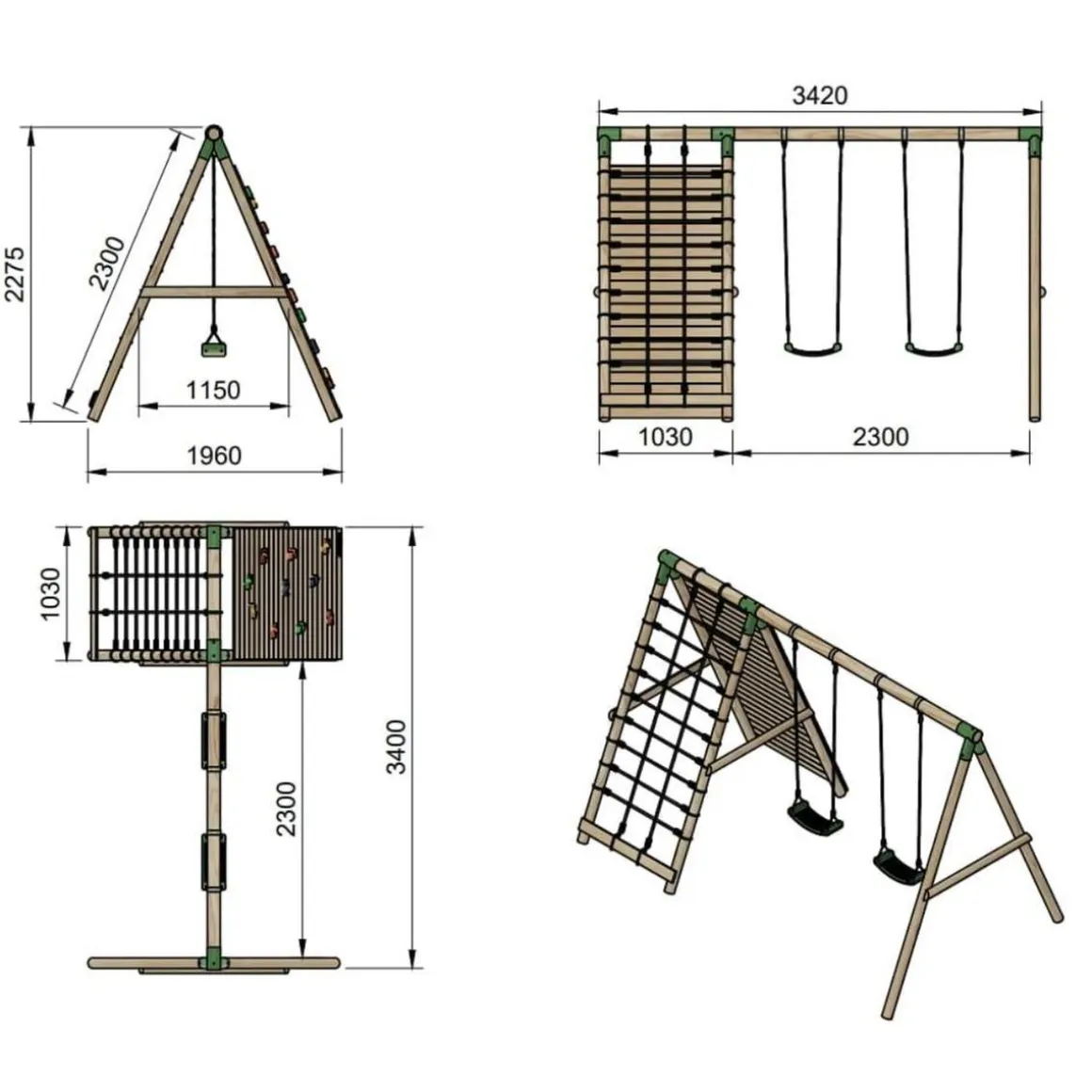 El parque infantil Masgames Timbu tiene las medidas: 342 x 196 x 227 cm. Peso máximo por asiento 70 kg. Las patas son postes redondos de 80 mm de diámetro, y el travesaño de 100 mm de diámetro.