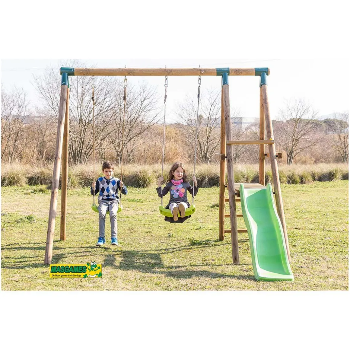 Parque juegos infantil de madera Milos. El parque infantil Milos está fabricado en madera oscura tratada y de alta calidad. La madera de estos columpios y parques infantiles de Masgames está seleccionada entre los mejores abetos y pinos, el material pasa por un tratamiento que hace que el parque resista la radiación solar. El método que se utiliza no es tóxico y está libre de arsénico. La presencia de la madera es oscura, la hace más bonita. La madera tiene muy buena calidad, ya que su madera está viva y es resistente, aunque se presencie grietas. Hace que el parque infantil tenga mucha durabilidad.