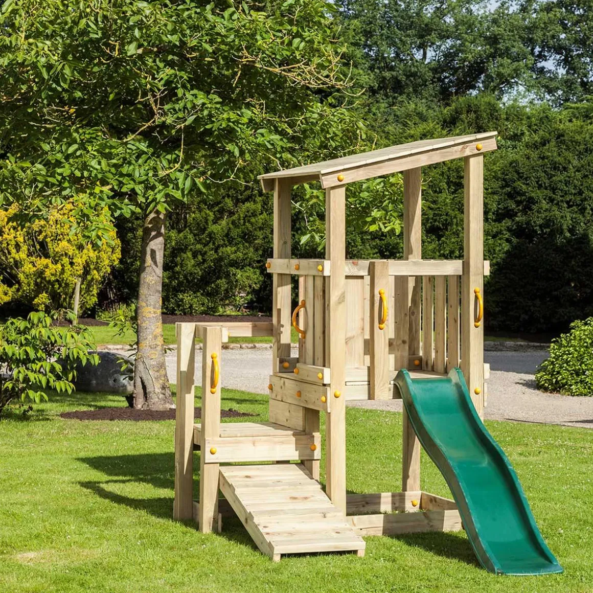 La torre infantil Cascade incluye las maderas, una rampa de tobogán de 0,90 m de altura, los anclajes para fijarlos en un suelo blando de tierra o césped, los tapones de perno, las manijas y las instrucciones de montaje. Los accesorios como los prismáticos, el timón, el telescópio, un tobogán de 0,60 m de altura acoplado al lado más pequeño, espejo mágico, etc no vienen incluidos.