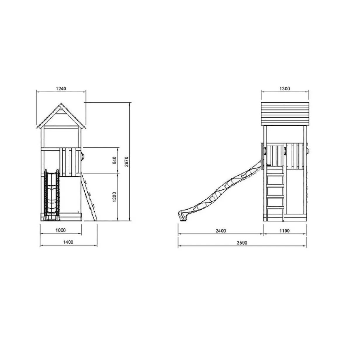 El acceso a la plataforma de la Torre Tibidabo es mediante una escalera de madera hasta el piso superior, a una altura de 120 cm. La plataforma, a esta altura, está protegida por los cuatro lados por la baranda de madera, por lo que queda muy protegida. Tiene aperturas solo en el acceso de la escalera y la salida del tobogán. La rampa de tobogán llevará a los niños a nivel del suelo, y volverá a empezar la aventura.