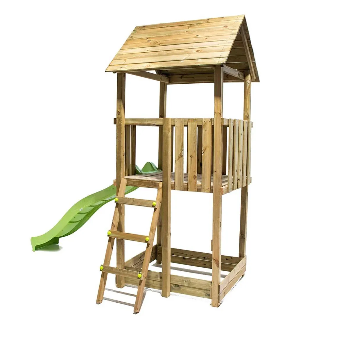 El parque infantil Tibidabo incluye todas las maderas para montar el parque y la escalera, la tornillería, la rampa de tobogán de color verde y los anclajes para fijarlos en un suelo blando de tierra o césped.