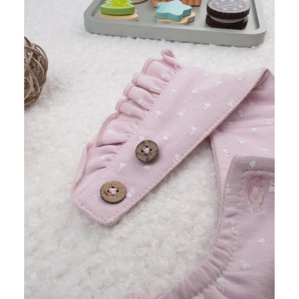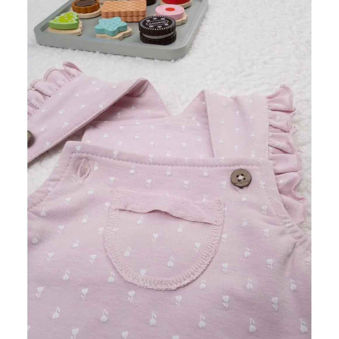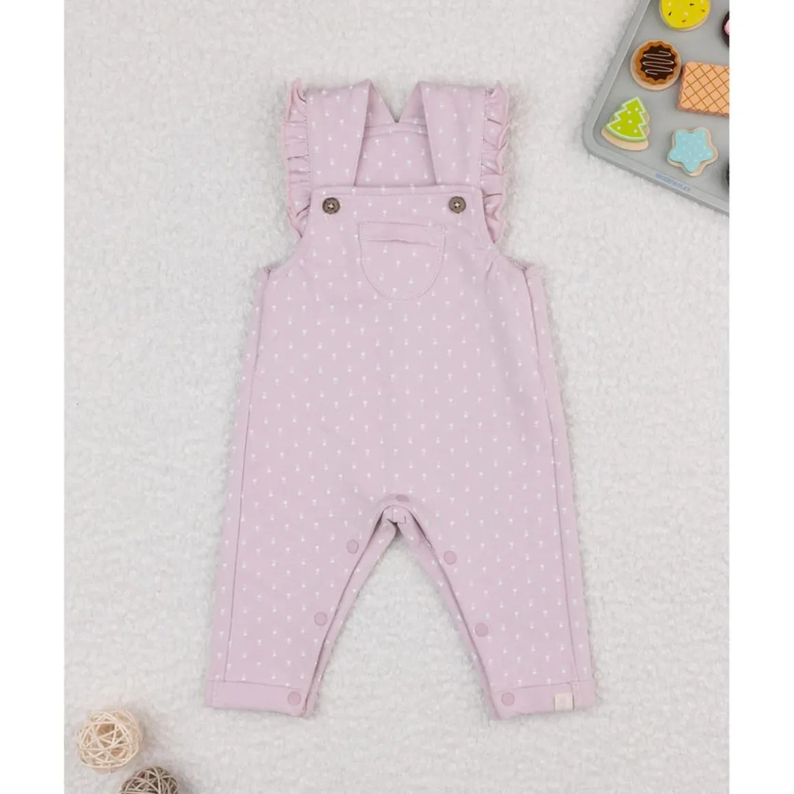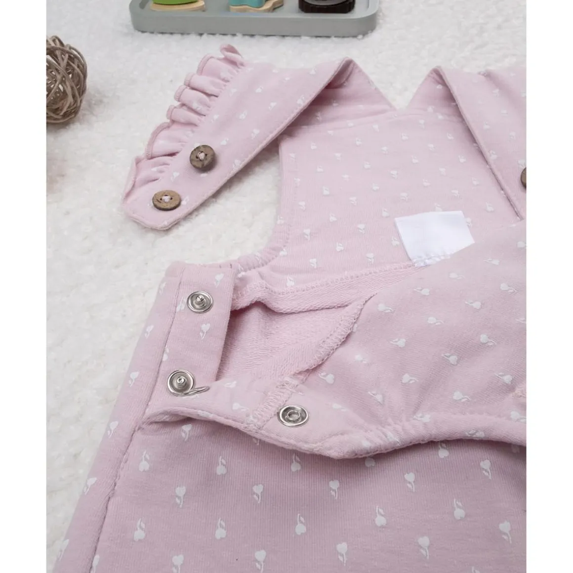 Peto tierno para niña en rosa claro con estampado allover tono sobre tono. Ajuste práctico con tirantes y botones, además de botones automáticos en la entrepierna. Confección en algodón Oeko-Tex, seguro y cómodo.