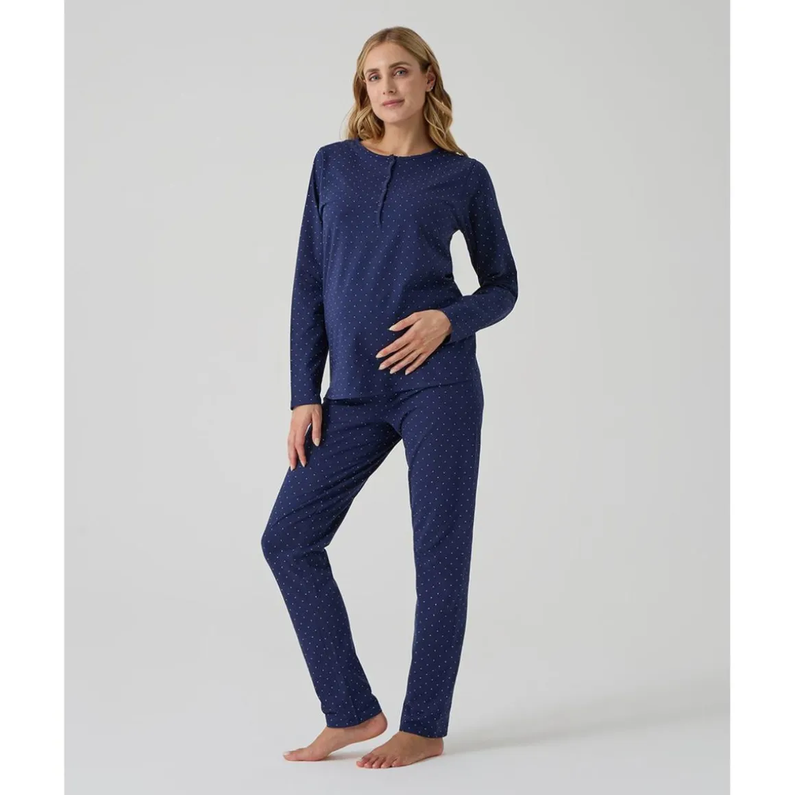 Este pijama premamá de dos piezas ha sido diseñado para el embarazo y la lactancia. Incluye camiseta de manga larga en azul con estampado de lunares blancos, escote barco y botones frontales que permiten amamantar con discreción. Los pantalones cuentan con cintura elástica para un ajuste cómodo durante toda la gestación.