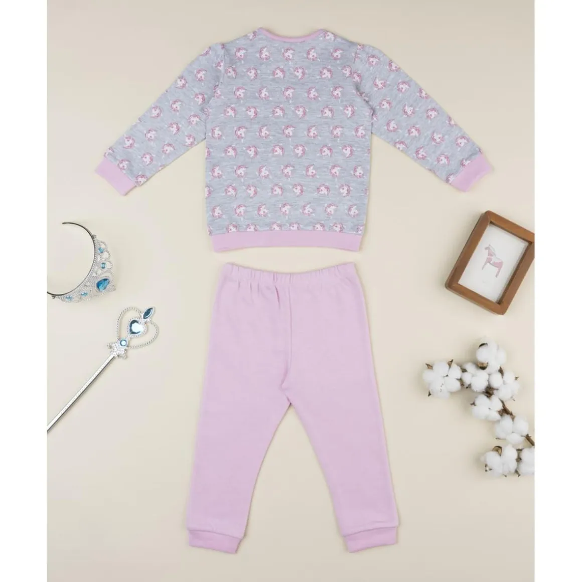 Tierno pijama de dos piezas para niña compuesto por camiseta gris con estampado allover de unicornios y pantalón rosa con cintura elástica. Su tejido suave proporciona calidez y confort nocturno.