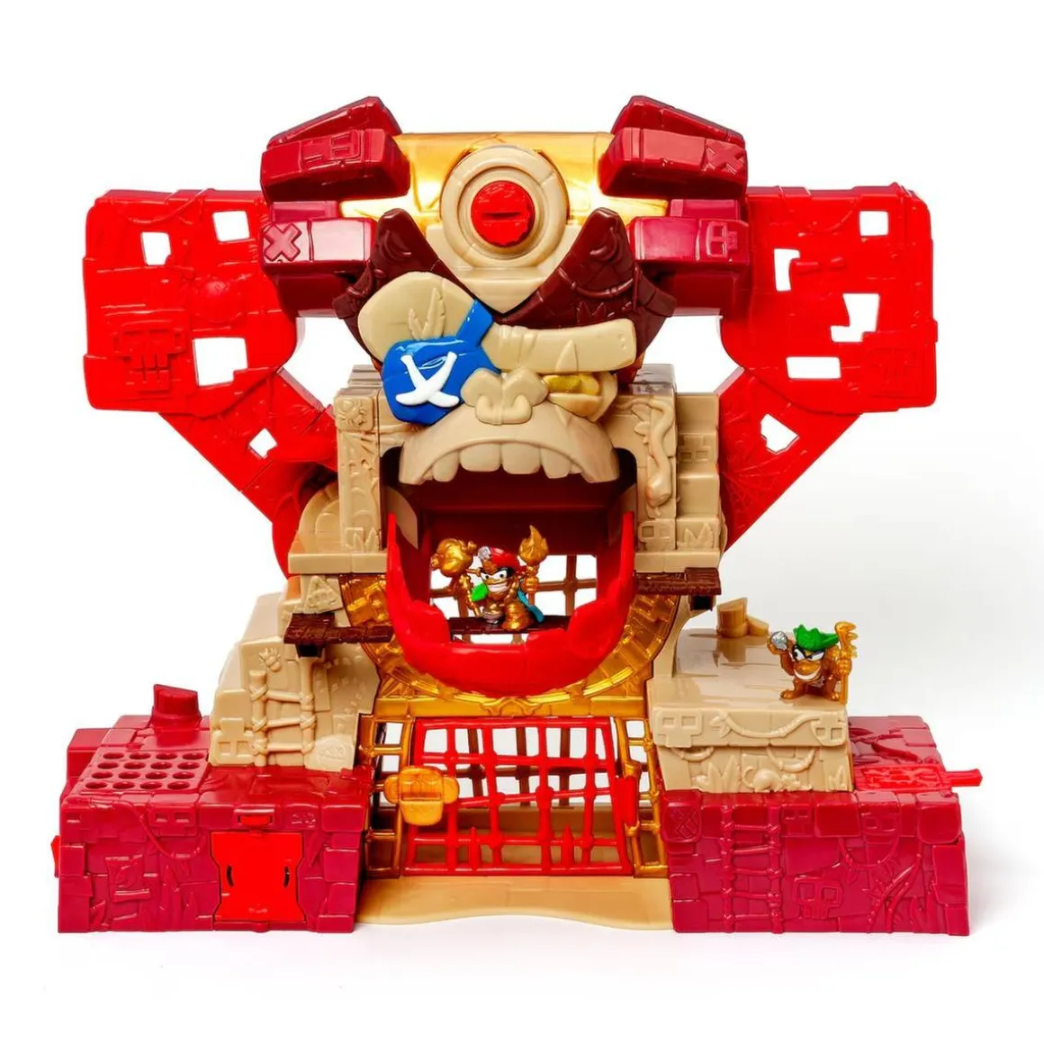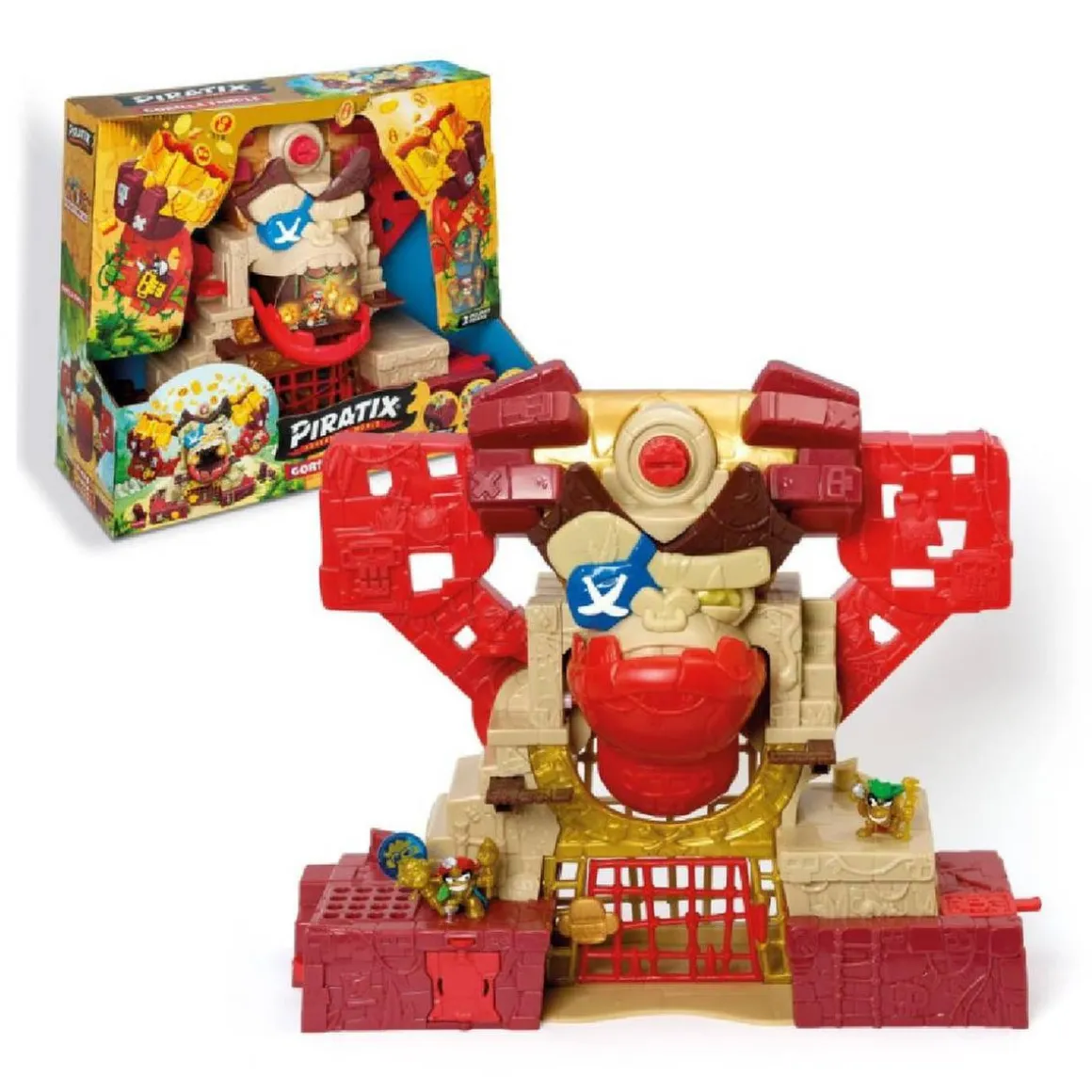 Encuentra la moneda y evita las trampas con pinchos y la catapulta. Usa la moneda para abrir la boca del gorila y descubrir si logras avanzar o si el templo te atrapa. Si caes en la prisión, ¡libera a los Piratix y sigue la aventura hasta vencer al gorila y romper el cofre del tesoro!