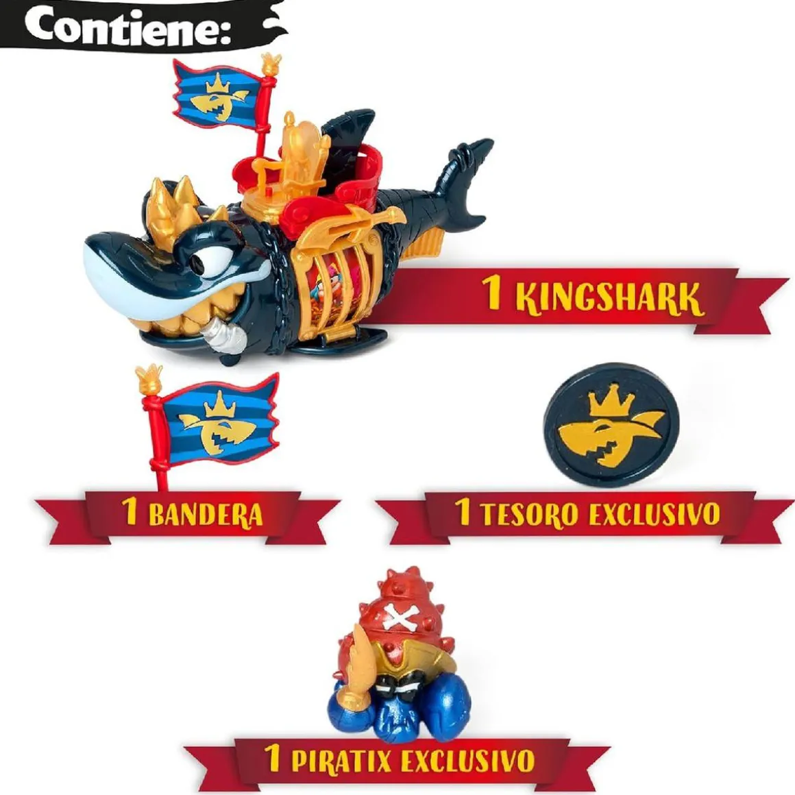 ¡No dejes pasar la oportunidad de añadir al formidable King Shark Golden Teeth a tu colección Piratix y vive aventuras inolvidables en las profundidades de Shark Island!