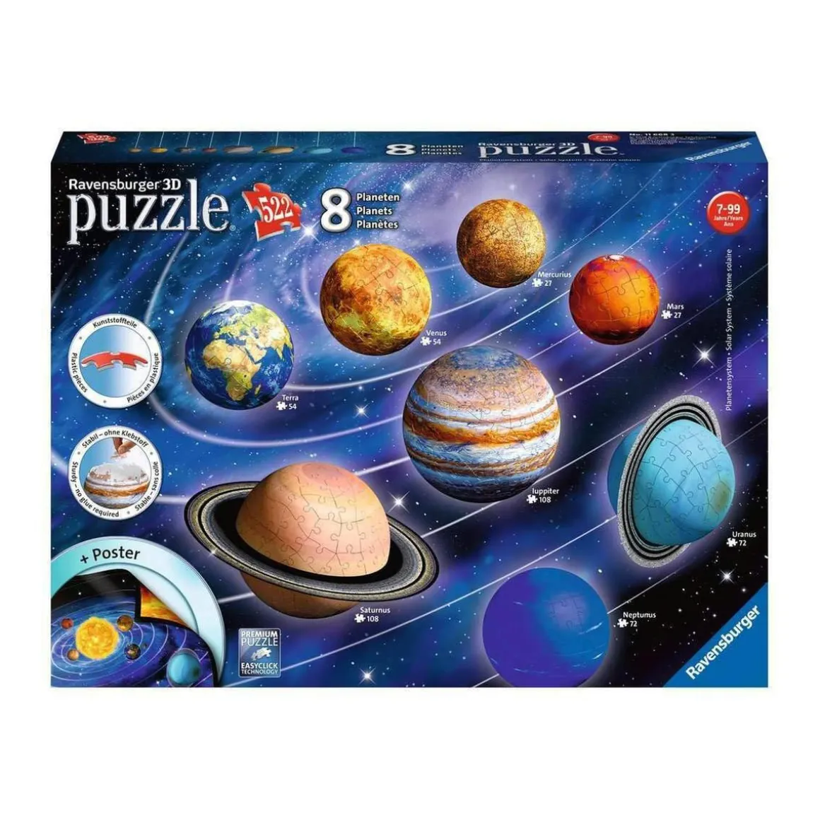 Ravensburger – Sistema Planetario 3D, 522 piezas para reproducir el sistema solar.