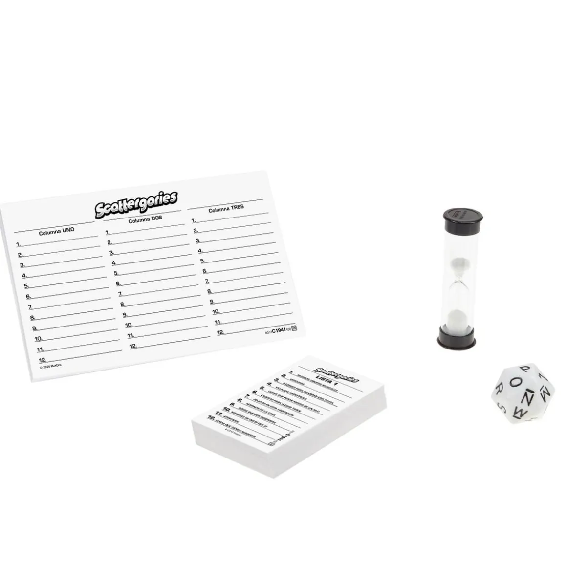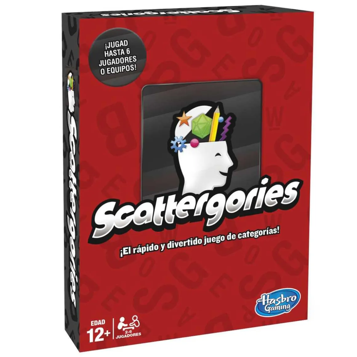 Scattergories, un juego de mesa de palabras que incluye 1 dado de 20 caras y 4 carpetas.