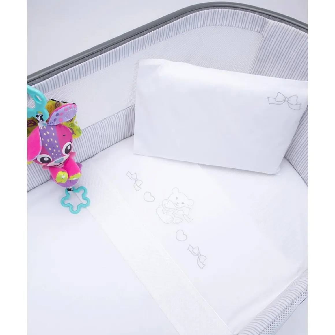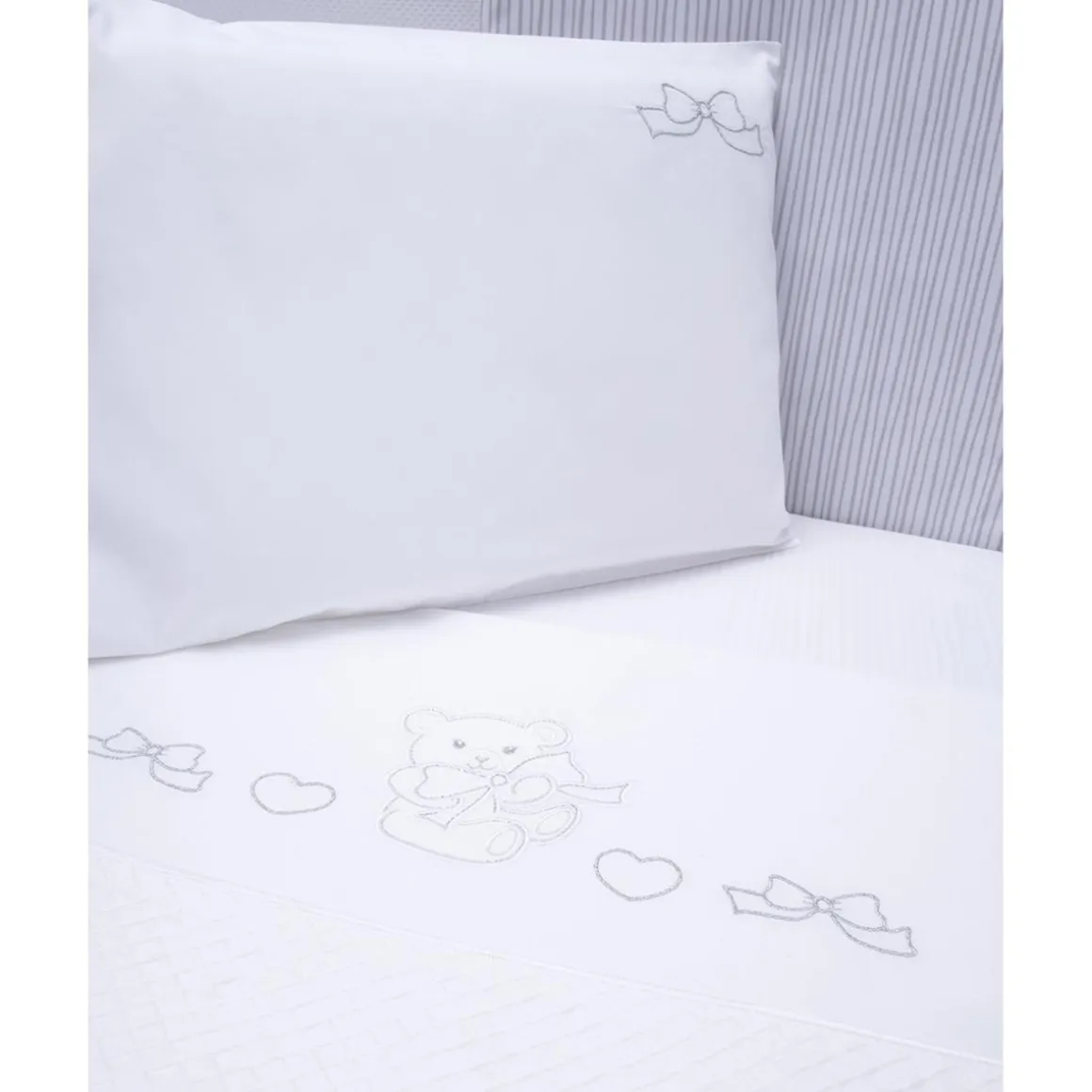 Este set de cuna/carrito de 3 piezas es ideal para ofrecer confort y suavidad al bebé. Confeccionado en 100% algodón, combina un fondo blanco con un delicado bordado de osito en tonos plateados.