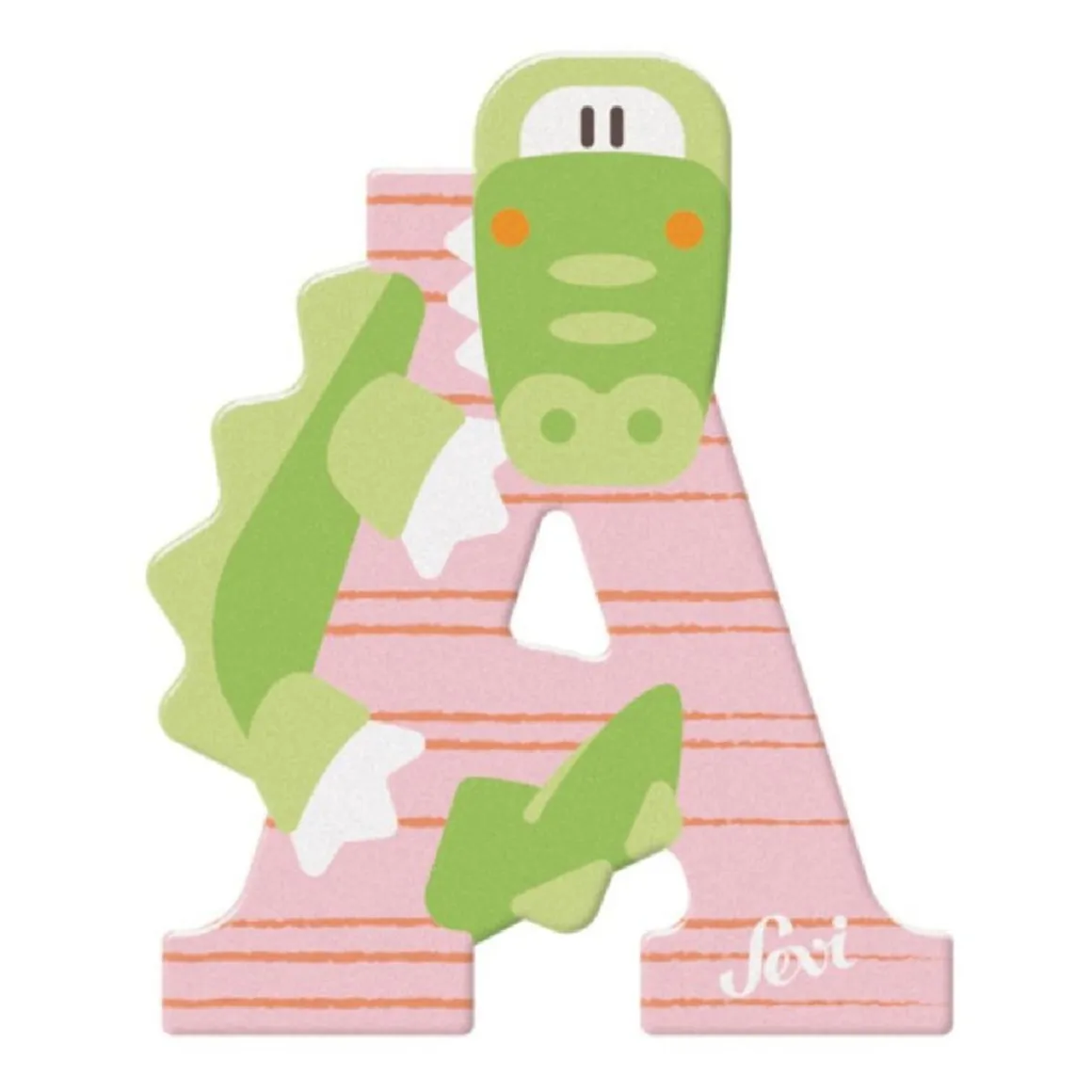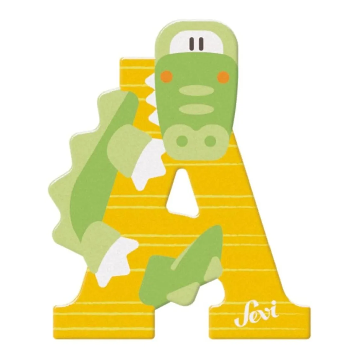Esta letra está elaborada en madera ligera y pintada a mano con colores vivos, captando la atención de los pequeños. Cada letra representa la inicial de un animal, en este caso, la ‘A’ de ‘Alligator’ (Caimán), introduciendo a los niños en el mundo animal mientras aprenden a reconocer letras y sonidos.