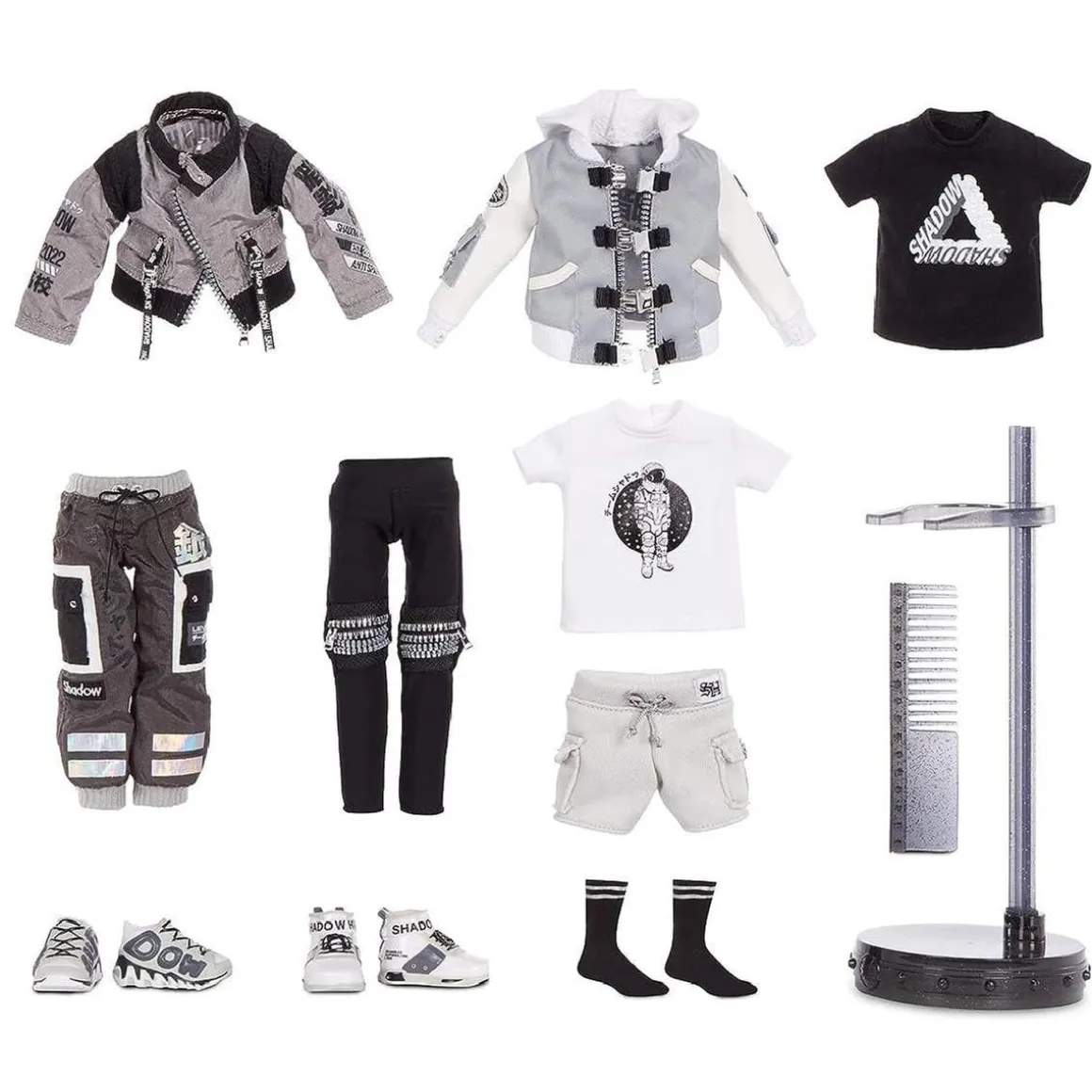 2 conjuntos: Ash viene vestido con una camiseta estampada, pantalones deportivos de nailon con gráficos y parches bordados, chaqueta de nailon con hebillas moldeadas y gráficos, y unas zapatillas Shadow. También viene con un segundo conjunto completo para mezclar y combinar. Camiseta estampada, pantalones con cremalleras, chaqueta con hebillas y estampados y unas zapatillas de caña alta.