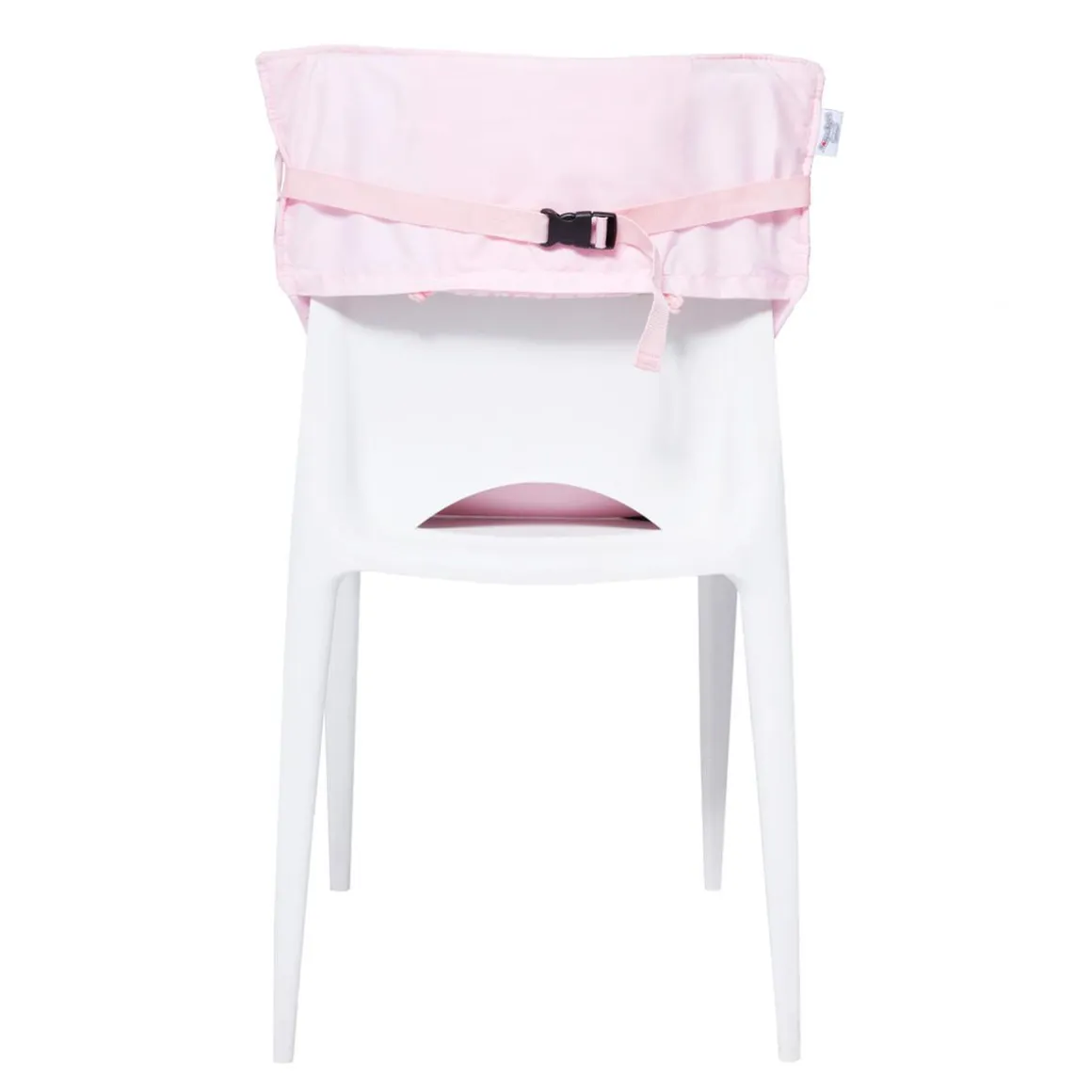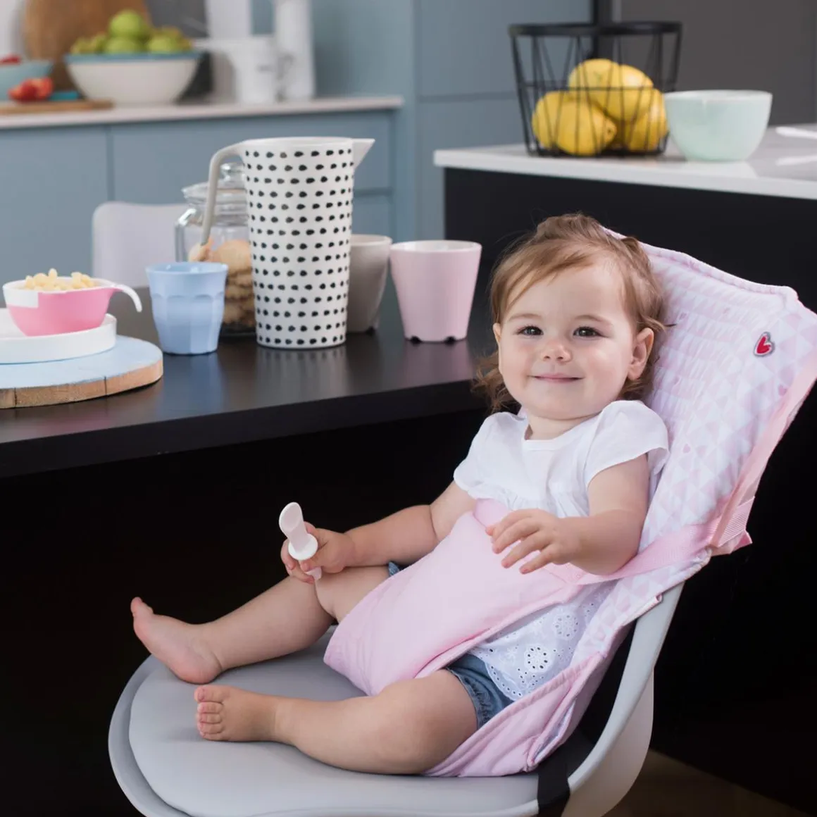 Silla Nómada – Pink Heart, una silla portátil muy compacta que permite al bebé estar sentado de forma segura y confortable en cualquier silla estándar.