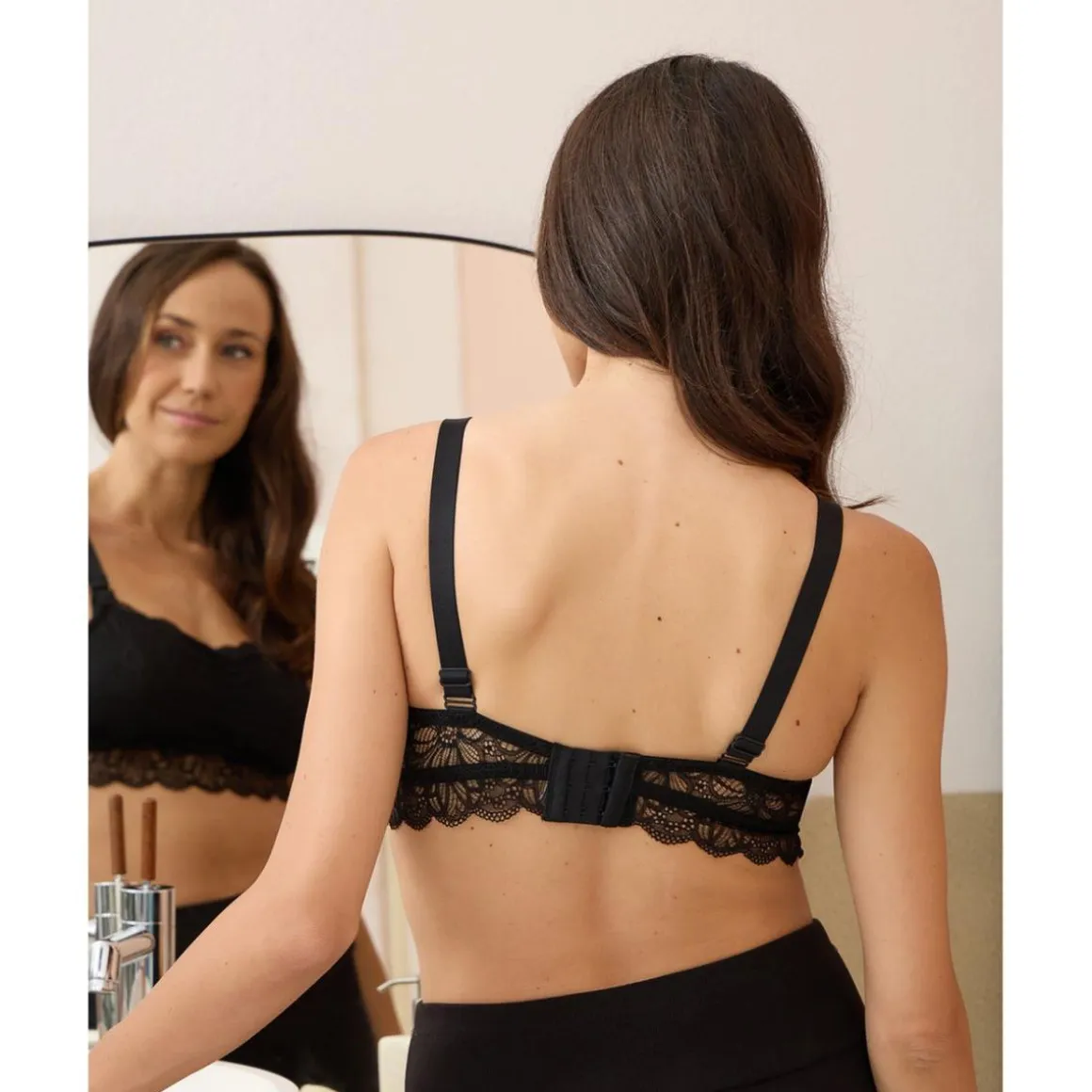 Cómodo sujetador de lactancia en romántico encaje negro con motivo floral. Copas desmontables que facilitan el momento de la lactancia y tirantes ajustables. También se puede usar como crop top.
