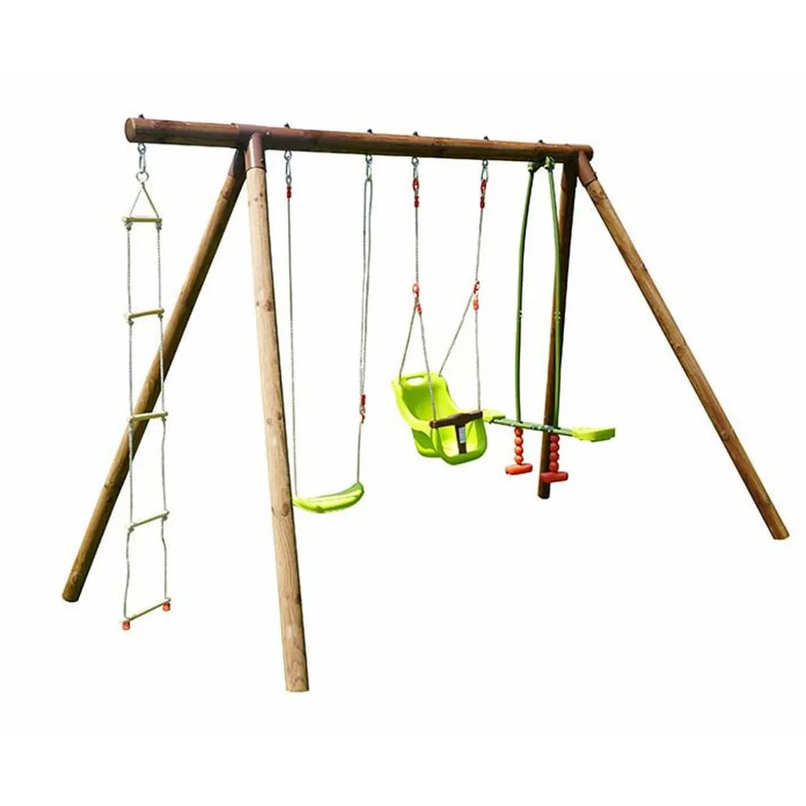 Se trata de un columpio de madera tratada con autoclave IV marrón. Es ideal para una casa con jardín, y para peques de 3 a 12 años.