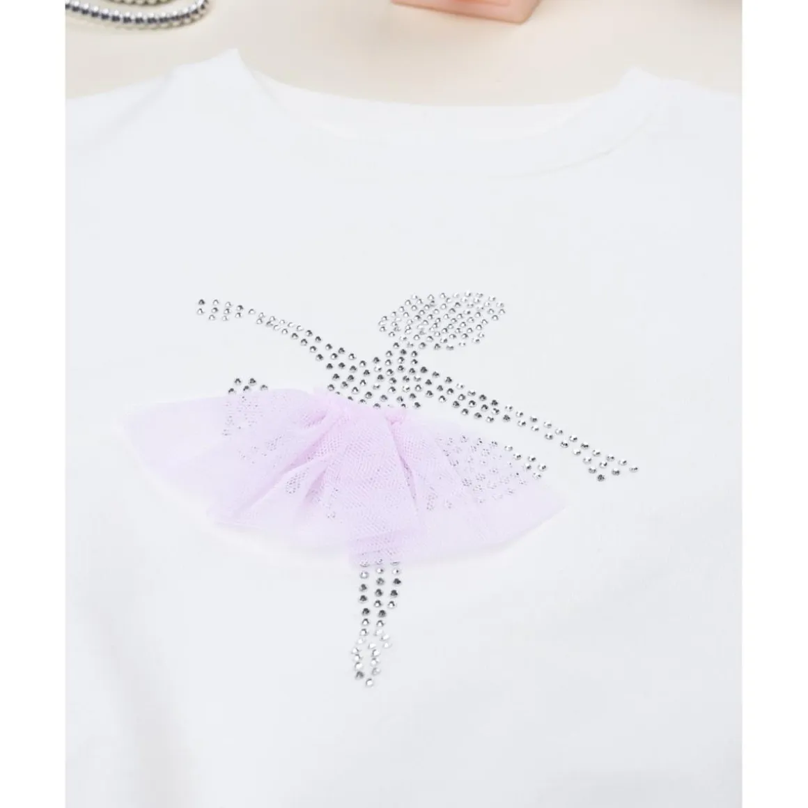 La sudadera blanca para niña presenta un delicado estampado de bailarina decorado con purpurina plateada. Su diseño de manga larga es cómodo y fácil de combinar para crear looks casuales llenos de encanto.