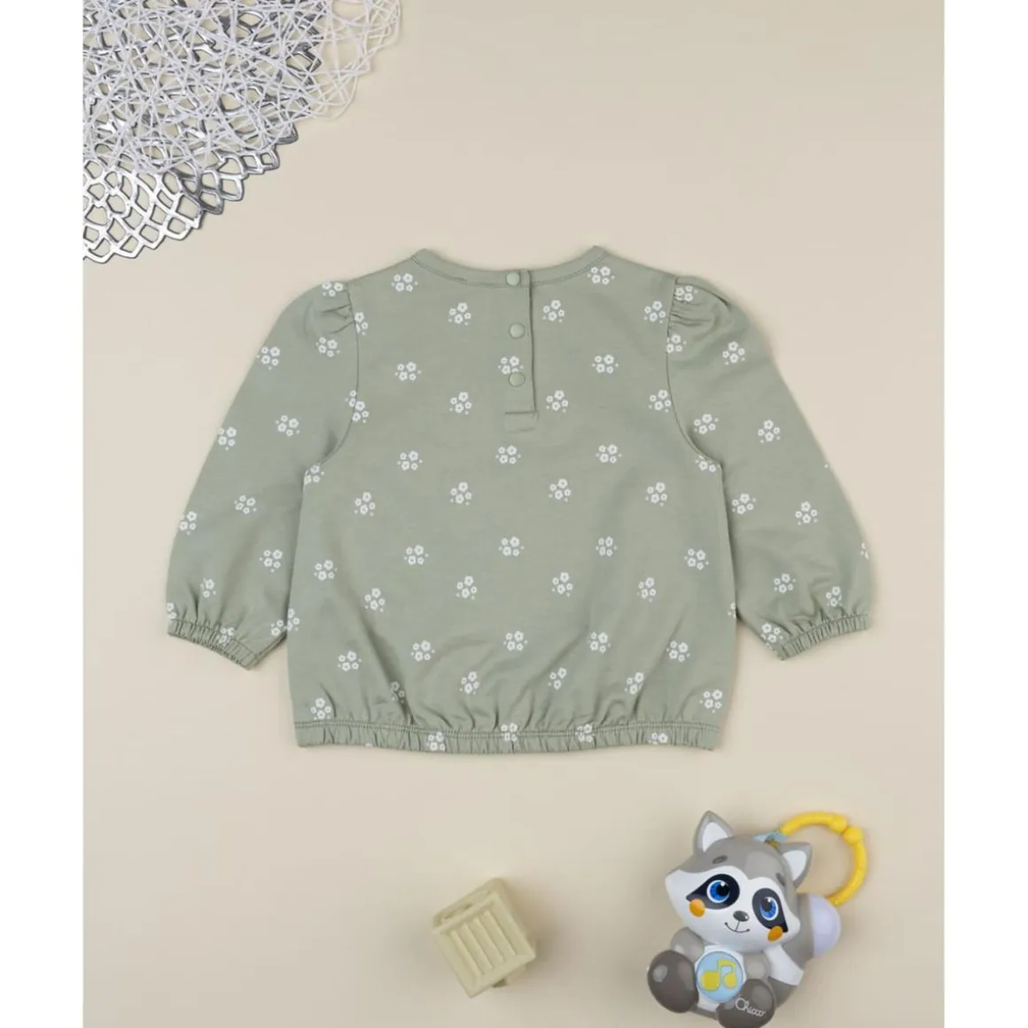 Sudadera casual afelpada para niña, en verde claro con delicado estampado floral blanco. Suave, cómoda y con botones automáticos en la espalda. Perfecta para climas frescos y looks informales.