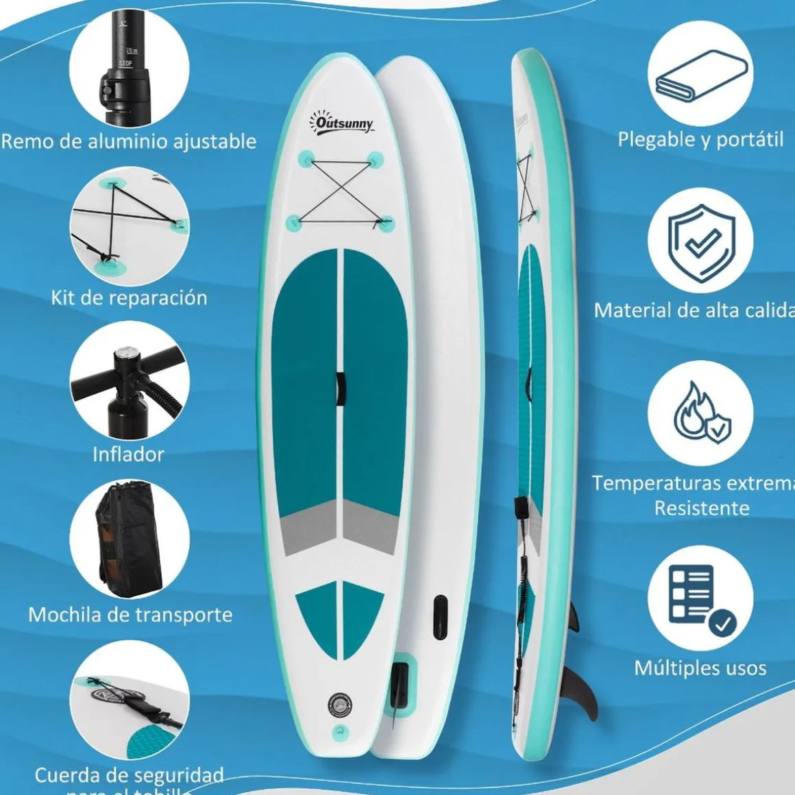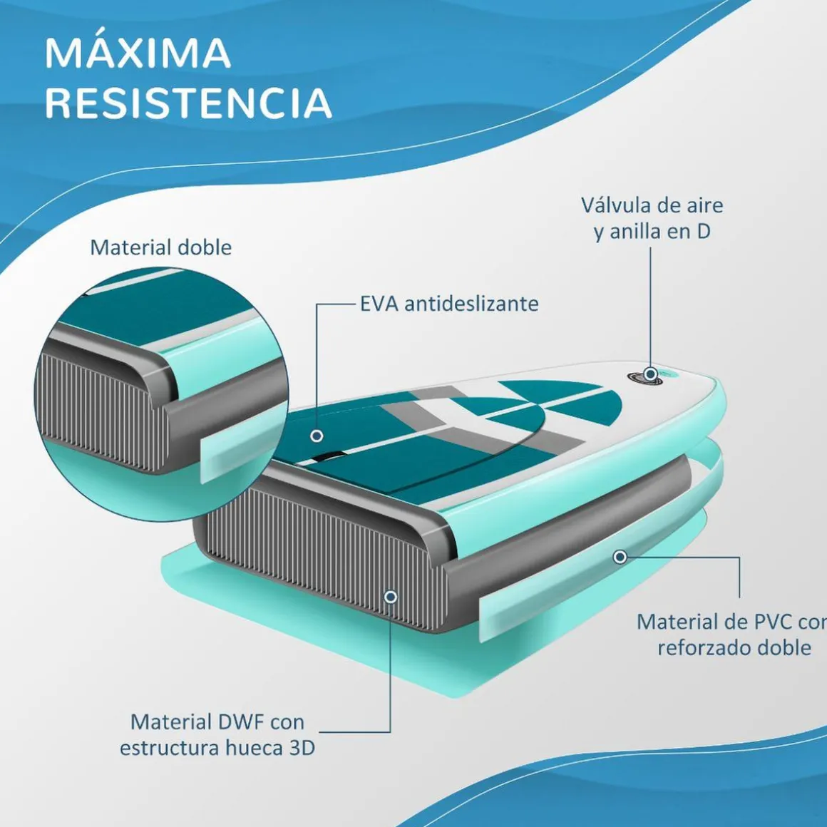 La superficie está fabricada con goma EVA antideslizante para aumentar la adherencia. Incluye una hebilla en forma de D con una correa para el tobillo para mayor seguridad, y viene con un compartimento de cuerda elástica de 3 m para mantener a salvo tus enseres personales.