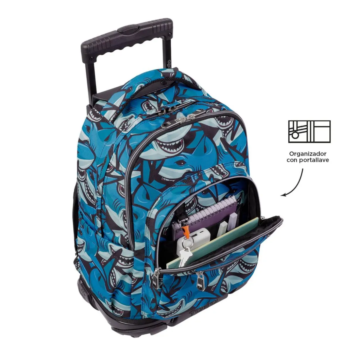 Totto – Mochila escolar con ruedas tiburones Renglones, una mochila fabricada con materiales muy resistentes de la colección Renglones.