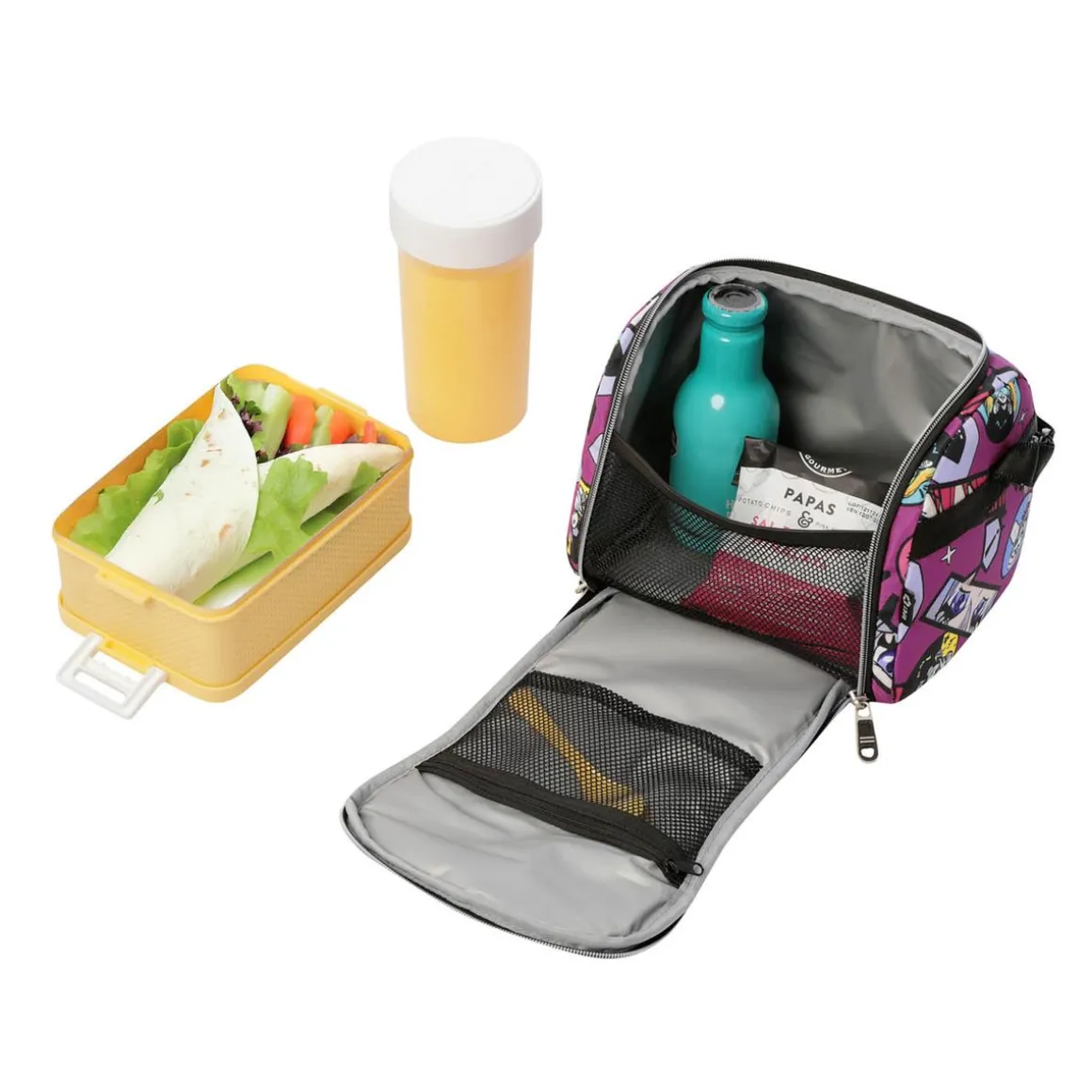 El portameriendas escolar Resaltador Kitsune es el compañero ideal para llevar tus almuerzos al colegio con comodidad y estilo. Su diseño moderno con detalles inspirados en el universo Kitsune aporta un aire divertido y único. Gracias a su apertura de 180°, podrás acceder fácilmente a su interior térmico, que mantiene la temperatura de los alimentos hasta cinco horas. Incluye bolsillos de malla con cremallera para organizar cubiertos, servilletas o pequeños recipientes. Fabricado en material RPET procedente de botellas recicladas, es resistente, fácil de limpiar y repelente a líquidos. Además, cuenta con correas ajustables y un pasador para integrarse en sistemas de ruedas. Perfecto para disfrutar de comidas frescas y bien organizadas en cualquier momento.
