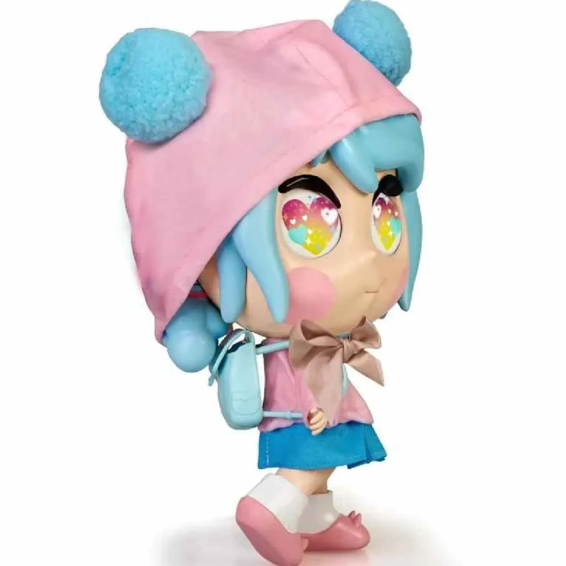 Mia va vestida con un look romántico que incluye un jersey rosa decorado con un lazo beige y una capucha con pompones azules a juego con su pelo. El conjunto se complementa con una falda plisada.