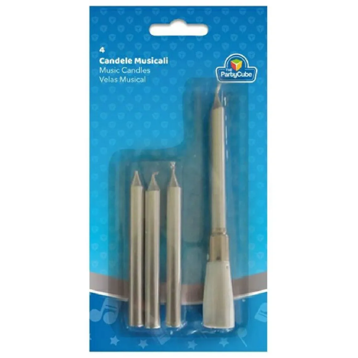 Este pack contiene 4 velas plateadas y un portavelas musical. ¡Ideal para el cumpleaños!